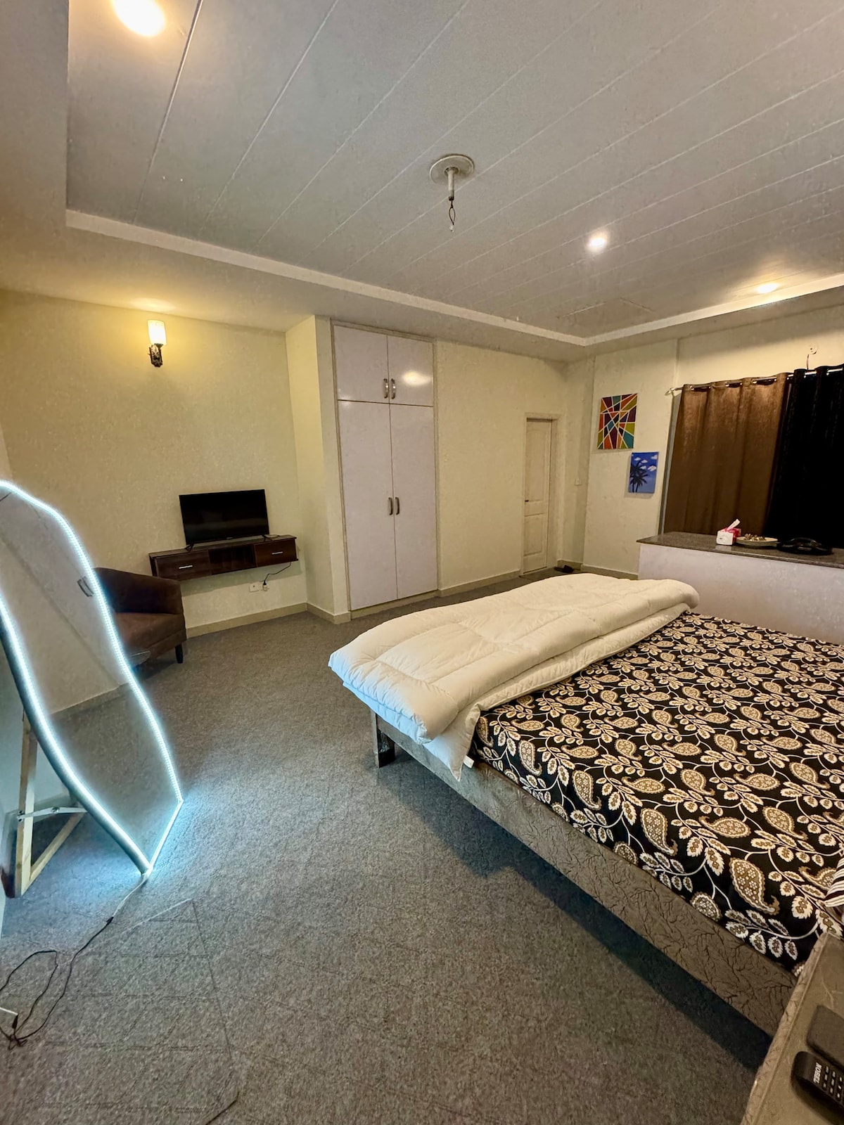 One of the best looking studio apartment in the vicinity. The apartment is situated in one of the most premium buildings of Buch villas at a very prime location. The vibe is very peaceful and comfortable yet stylish. It is at the 1st Floor also the building has a lift, providing easy access for guests with mobility needs, including those using wheelchairs. An inverter has been installed to ensure a cozy atmosphere and a comfortable stay, along with an Android LCD featuring Netflix acces