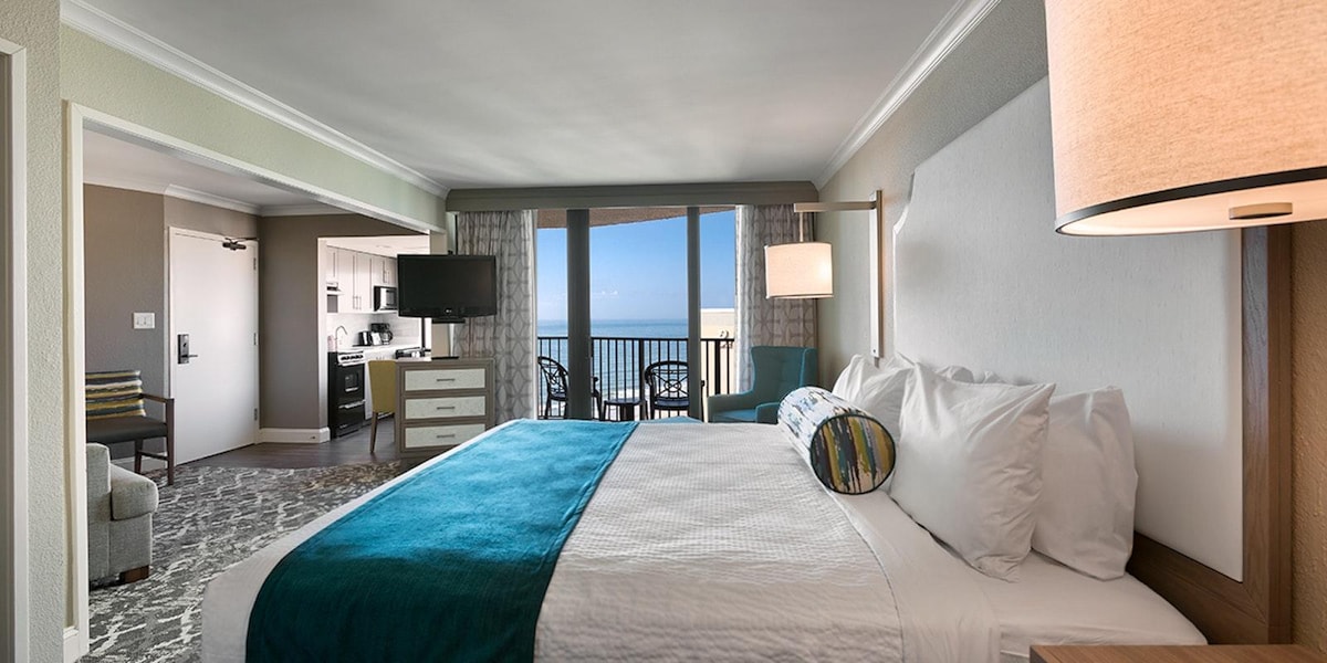 Suite ta' Kamra tas-Sodda Waħda Faċċata tal-Oċean • L-Aħjar Veduti fil-Bini • Tajba għall-Annimali Domestiċi! Stenbaħ b'veduti mill-isbaħ tal-baħar f'din is-suite b'kamra tas-sodda u kamra tal-banju fil-Patricia Grand Resort, wieħed mill-iktar postijiet imfaħħra! Spazjuża, moderna u addattata għall-pets, b'żona apposta għall-klieb eżatt ħdejn il-bieb. Irrilassa fil-gallarija privata tiegħek, sajjar fil-kċina mgħammra jew irrilassa fiż-żona tal-għajxien komda — kollox ftit passi biss 'il bogħod mill-Myrtle Beach Boardwalk u attrazzjonijiet lokali. Gawdi l-isbaħ veduti fil-bini għal żjara li ma tinsiex!