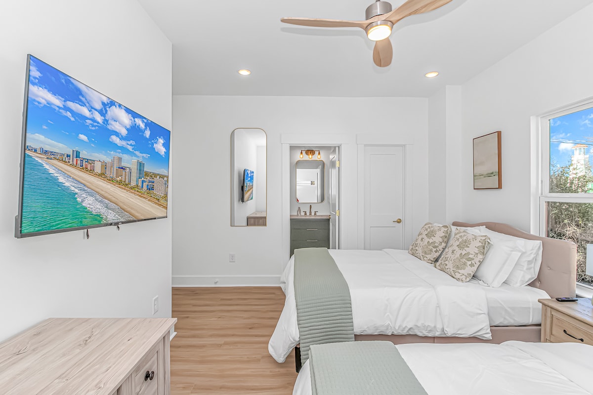 Mibnija reċentement u mżejna b 'mod sabiħ, din id-dar tinsab fil-qalba ta' Myrtle Beach fuq 48th Avenue N. Fi ħdan id-distanza bil-mixi tal-għoljiet ħodor li jduru tal-korsa tal-golf ta' Myrtlewood, hija wkoll minuta sewqan mill-famuża Broadway fil-Bajja (xiri, gost għat-tfal, rikbiet, u nightlife), u biss 5 minuti mill-bajja! Minħabba l-COVID-19, din id-dar issa qed tuża * servizzi ta 'tindif u sanità żejda* qabel kull żjara sabiex tiżgura li l-vjaġġ tiegħek ikun nadif kemm jista' jkun!
