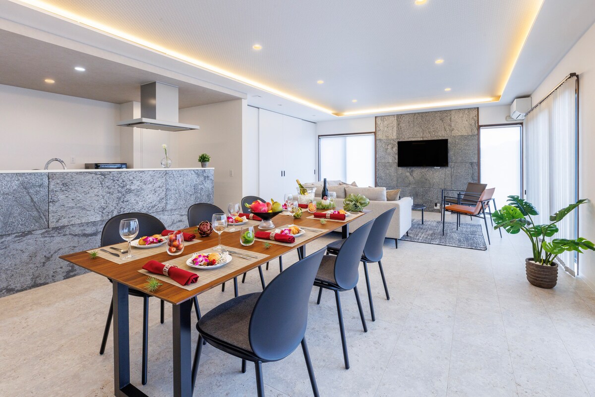 Din il-villa ta' familja waħda faċċata tal-bajja li għadha kif inbniet u tlestiet fl-2023 hija biss 80 metru 'l bogħod mill-iktar destinazzjoni famuża tal-fotografija taż-żwieġ ta' Okinawa [Kise Beach]. Hemm parks tal-baħar bil-ħlas, sport tal-ilma u proġetti oħra ta' divertiment fil-qrib. Din il-villa hija l-Bini 1 (massimu ta' 10 persuni). Adattat għall-ivvjaġġar tal-familja, għall-ivvjaġġar fl-iskola, għall-vaganzi tal-koppji, għall-ivvjaġġar għax-xahar tal-għasel, għall-bini tat-tim tal-impjegati tal-kumpanija, għall-ivvjaġġar f' turnew tal-golf u għal attivitajiet oħra.