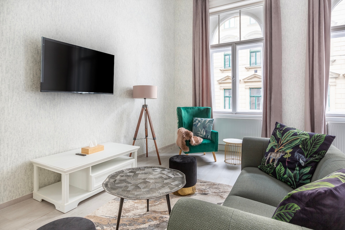 L-appartament b' stil uniku tagħna huwa ispirat mill-ħolma ta' disinjatur ta' ġewwa, armonija perfetta ta' lussu u kumdità. B' veduti panoramiċi uniċi tal-Parlament u tad-Danubju, l-appartament joffri veduta unika tal-belt. L-ispazju spazjuż, ideali għal 3 persuni, jissodisfa l-ħtiġijiet kollha tiegħek. Iċ-ċentru tal-belt jinsab 'il bogħod bil-mixi, biex b' hekk tkun faċli tiskopri l-attrazzjonijiet ewlenin tal-belt. L-appartament joffri kumdità u lussu b' disinn ta' ġewwa eċċezzjonali u għamara komda.