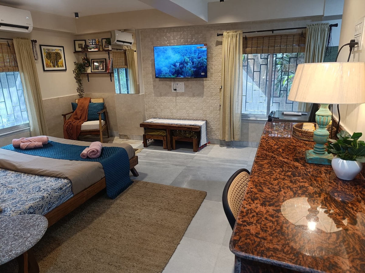 Studio ta' Penthouse Komda Adattata għall-Koppji Qrib Netaji Metro Oqgħod f' dan l-istudio tal-penthouse spazjuż u mdawwal sew fit-tielet sular ta' Annapurna Residency, 4 minuti bil-mixi 'l bogħod minn Netaji Metro, suq u ċentri tat-trasport. Ideali għax-xogħol jew għar-rilassament, fiha proġekter ta' 6x4 piedi, spazji tax-xogħol, massager għar-riġlejn, massager tal-ġisem, spa tas-saqajn u affarijiet essenzjali tal-fitness bħal tapit tal-yoga, piżijiet u pull-up bar. Post fejn toqgħod kwiet bil-kumditajiet moderni kollha.