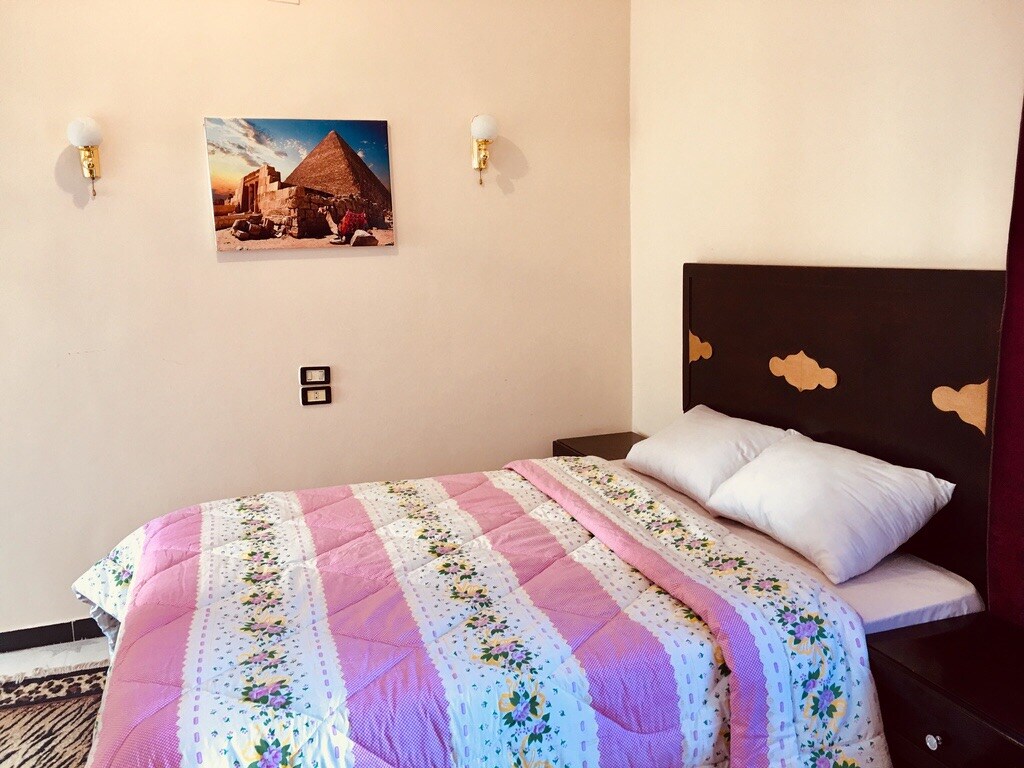 Il-kamra tinsab fis-sular 2 tagħna u hija waħda mill-kmamar li għadhom kif ġew irranġati. Il-klijenti se jieħdu gost joqogħdu f 'kamra b' tema Eġizzjana ddisinjata b' mod sabiħ b' 1Sodda doppja, sodda Queen u Piramidi Veduta mill-bejt!Hemm stazzjon tal-kafè/te b 'ilma komplimentari. Dan huwa negozju mmexxi mill-familja, u meta tkun hawn, inti familja. Kwalunkwe ħaġa li għandek bżonn, għidilna. Kull kamra għandha kamra tal-banju privata tagħha.