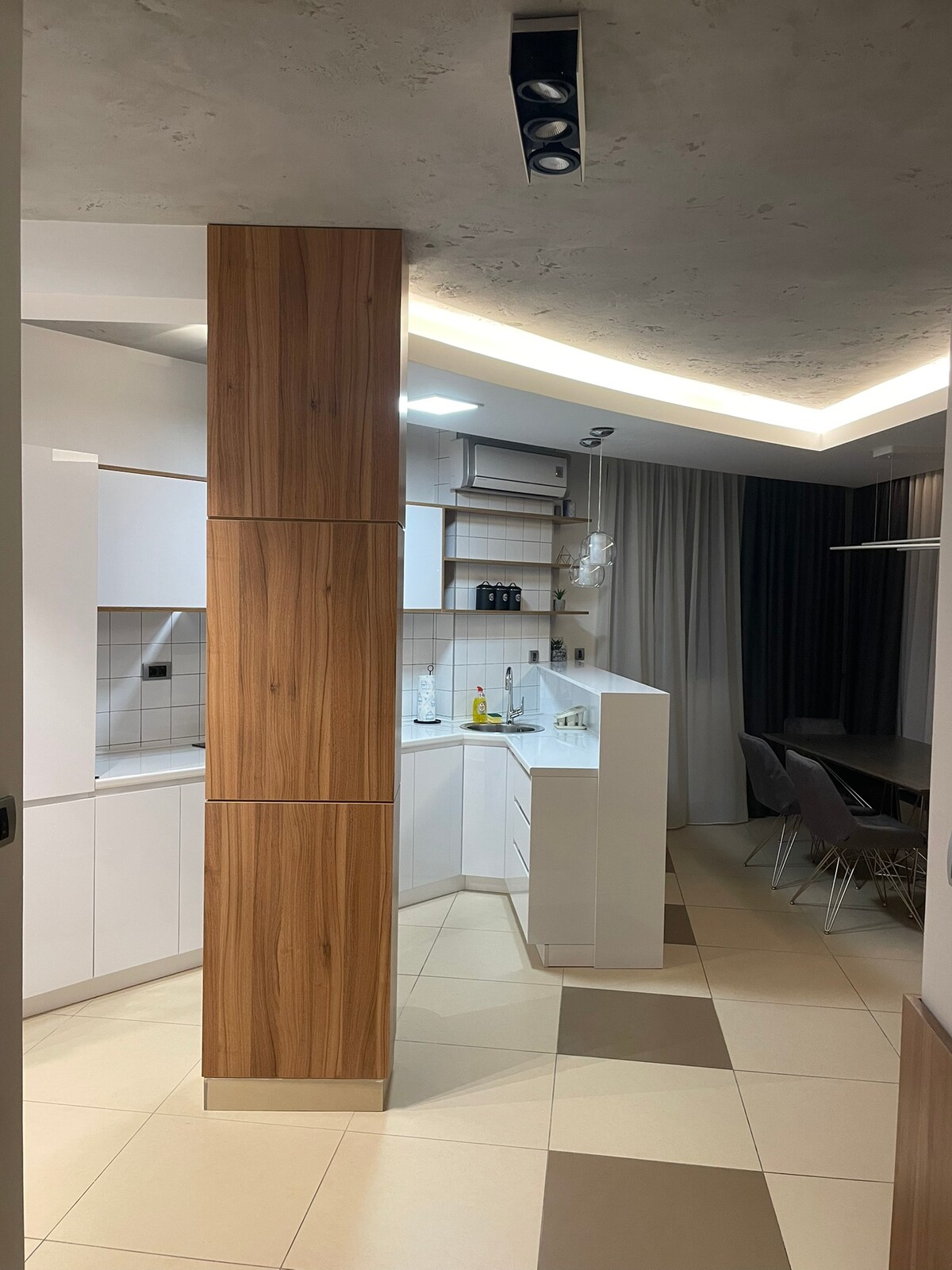 Fjamanta ġdida 65 metru kwadru f 'kumpless lussuż fiċ-ċentru tal-belt. Parkeġġ fuq ġewwa bla ħlas fil-garaxx. Jinsab fi triq pedonali. Kċina tad-disinjatur bil-magna Nespresso. Dekor modern tal-istil Taljan. Żewġ televiżjonijiet LED bi skrin ċatt. L-ogħla livell ta 'arja kkundizzjonata. Gallarija li tħares lejn ix-xmara. 2 kmamar tas-sodda: kamra ewlenija u kamra żgħira b' sodod bunk.