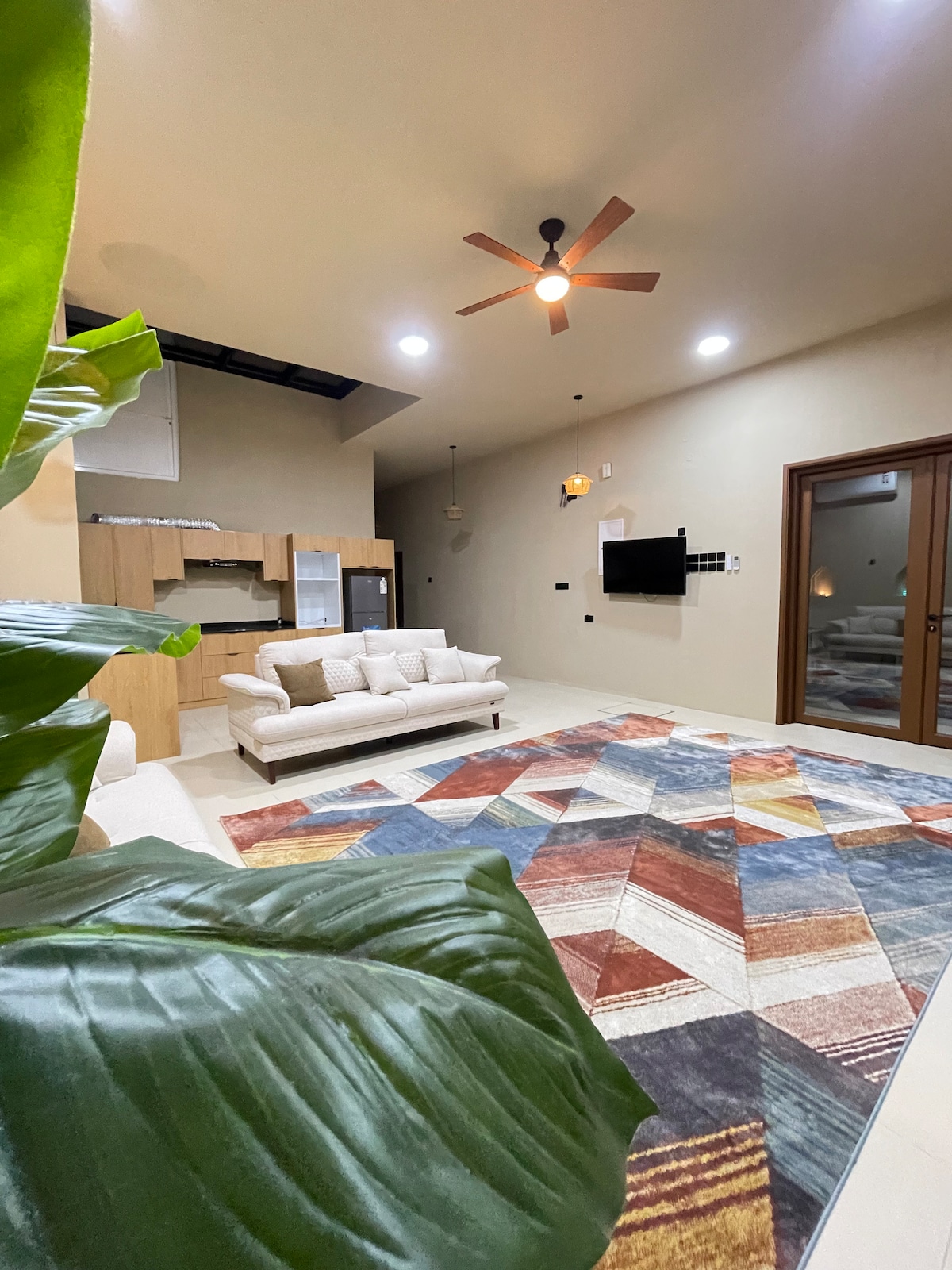 The location of Nature house is on the edge of the FARM LANDS of Al Hamra. The garden offering a green tranquil escape into the heart of nature, you'll find date palm and fruit trees, colourful flowers, and birds passing by. After a day of exploring, you can unwind in a hammock or relax in one of the many peaceful spots in the garden.