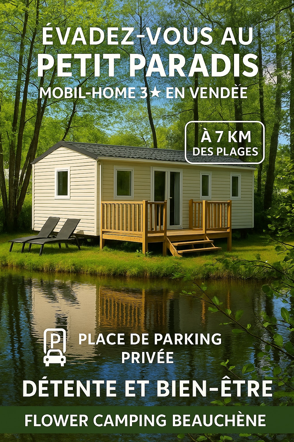 MOBIL-HOME confortable & cosy 40m2 au calme, idéal pour vacances ou déplacement CONTROLE entre 2 locations, draps et serviettes jetables fournis LOCATION linge tissus SEJOUR CENTRAL , parties nuits aux extrémités 3 CHAMBRES, 1 lit double & 4 lits simples, 2 Salles d'eau & 2 WC CHAUFFAGE dans toutes les pièces, double vitrage, stores occultants et moustiquaires dans les chambres TERRASSE COUVERTE, parking privé ARRIVEE de 14 à 21 heures et départ 11 heures Sans SUPPLEMENT énergétique
