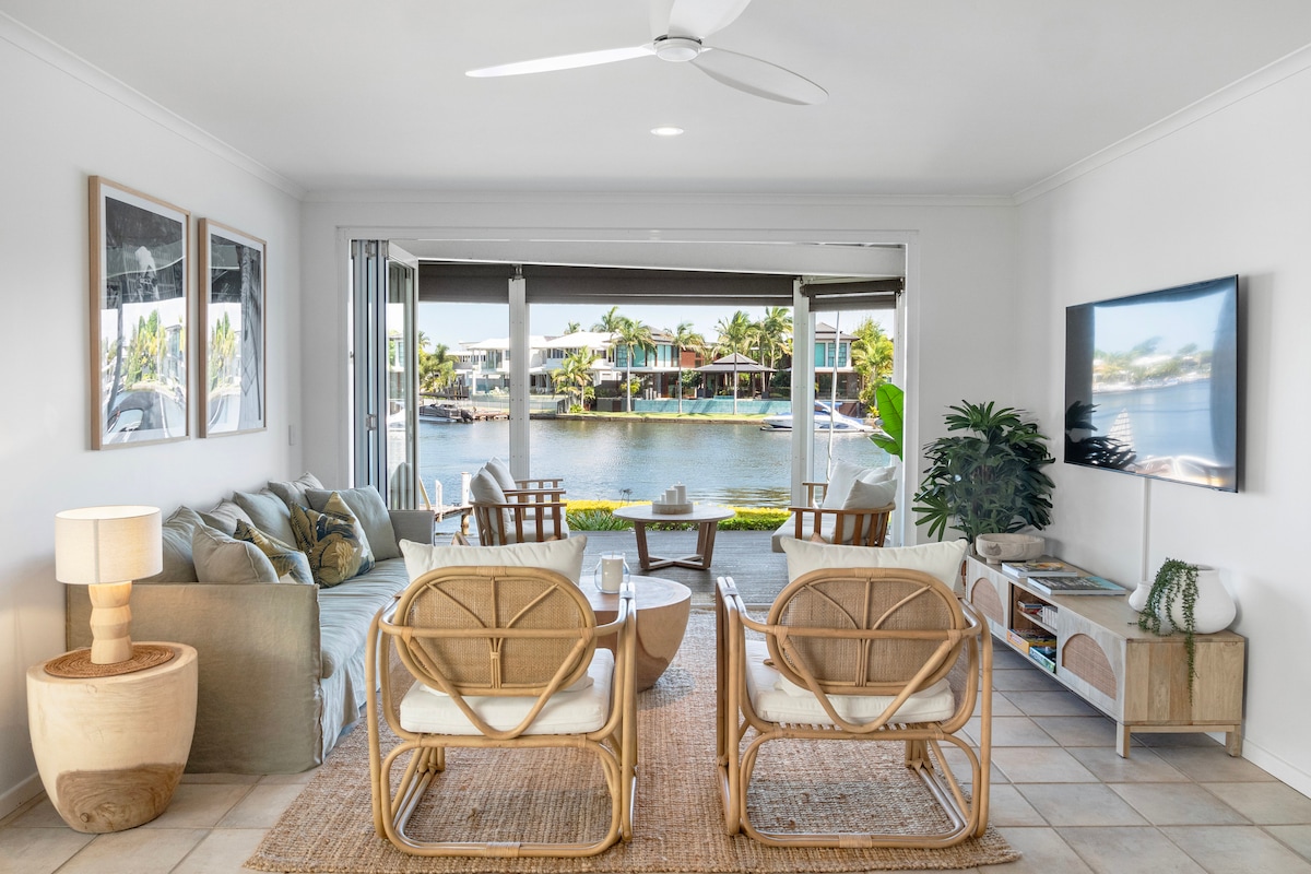 Post fejn tista' tgawdi x-xemx. Townhouse fuq il-baħar b'moll privat, f'post rilassat mal-kosta. B'ħafna dawl naturali u riħ ħafif mill-baħar, dan il-kanal spettakolari ir-residenza hija waħda mill-aqwa postijiet fejn toqgħod għall-vaganzi ġewwa Noosa Waters. Kemm jekk tħobb tħares lejn ix-xemx nieżla fuq il-kanali mill-lounge ta' barra koperta jew tħobb tpoġġi saqajk fuq il-moll, żgur se tixtieq terġa' tiġi f'dar tal-vaganzi mill-isbaħ bħal din.