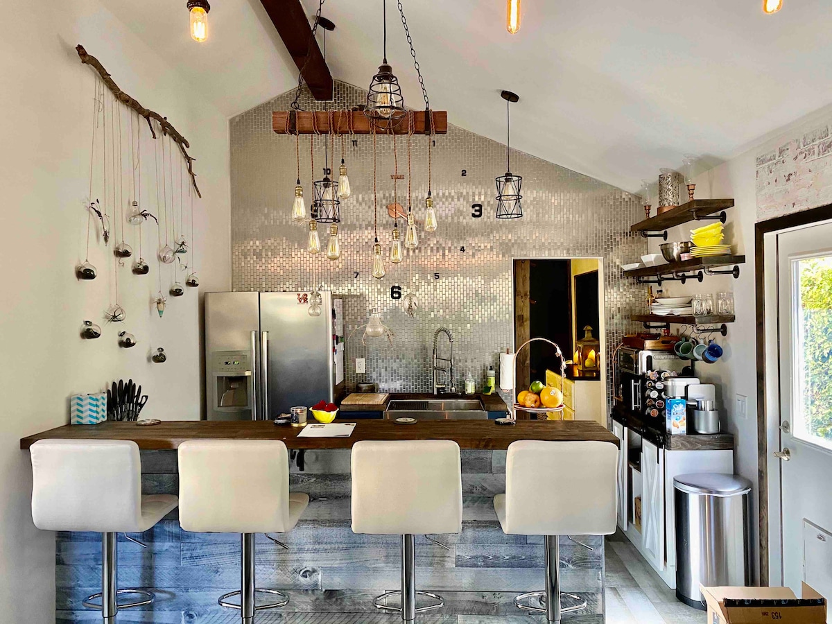 Post fejn tistrieħ mimlija arti b'oġġetti uniċi, ġnien mimli ħaxix u pjanti, għadira żgħira, pixxina privata u spa, firepit u kċina fuq barra. Irrilassa f'triq kwieta li ma tiftaħx għal barra b'żewġ terrazzini fid-dell, divertiment modern bħal TVs bi streaming, ħoss surround, mejda tal-pool żgħira u Xbox. Post ideali għall-familji, il-ħbieb, il-koppji jew dawk li qed jivvjaġġaw fuq xogħol li qed ifittxu post komdu u privat ħdejn Disneyland u l-iktar postijiet interessanti ta' California t'Isfel.