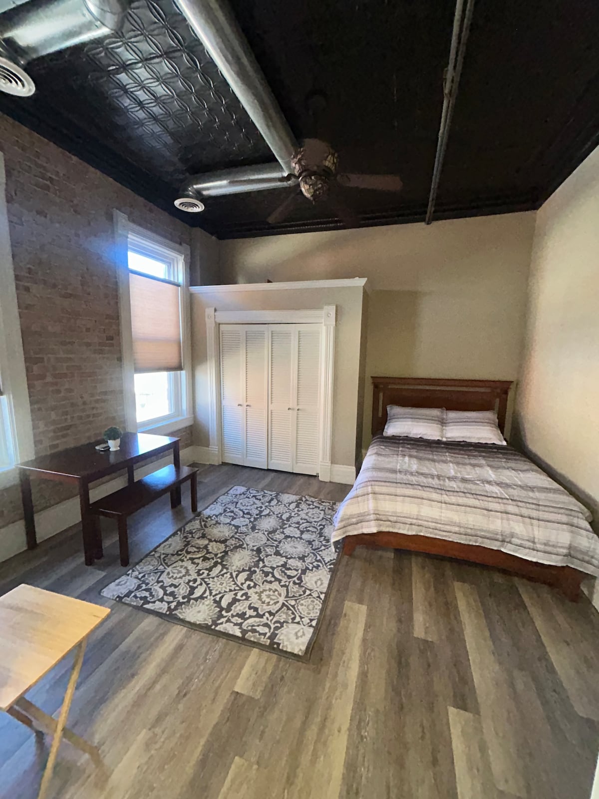 Merħba fil-vaganza moderna tiegħek fiċ-ċentru! Dan l-istudio eleganti għandu sodda queen komda, skrivanija tax-xogħol u ħażna wiesgħa b' armarju, dresser u kxaxen ta' taħt is-sodda. Il-kċina mgħammra b' kollox tinkludi friġġ, forn, oġġetti tat-tisjir u affarijiet essenzjali għall-ikel. Gawdi bar tal-kafè b' Keurig, microwave u toaster. Il-kamra tal-banju għandha taħlita ta' banju/doċċa u apparat li jsaħħan ix-xugamani. B' Wi-Fi bla ħlas, self check-in mingħajr ċavetta, post qrib iċ-ċentru, dan l-ispazju huwa ideali għall-ivvjaġġar! Hemm parkeġġ fit-triq