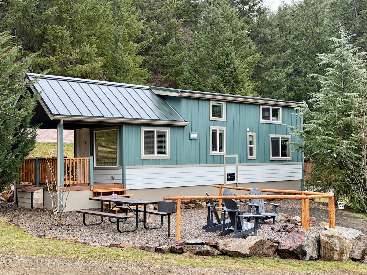 Kabini Rustiċi tal-Muntanji - Glamping! Il-Kabini King ħelwin tagħna jinsabu perfettament tul ix-Xmara North Umpqua fil-Foresta Nazzjonali ta 'Umpqua. Dan ir-reġjun ta 'Oregon Cascades normalment jissejjaħ "Emerald-Jewel Gateway ta' Oregon" sal-Lag Crater. Aħna jinsabu ċentralment għall-Tramuntana Umpqua Trail, ma 'drives faċli għall trailheads ħafna, kaskati & l Umpqua Springs Hot. Il-Kabini King għandhom sodda doppja 'King' u loft w/ double bed. Id-dar tal-banju/doċċa maqsuma mal-oħrajn tinsab ftit passi 'l bogħod mill-kabini.