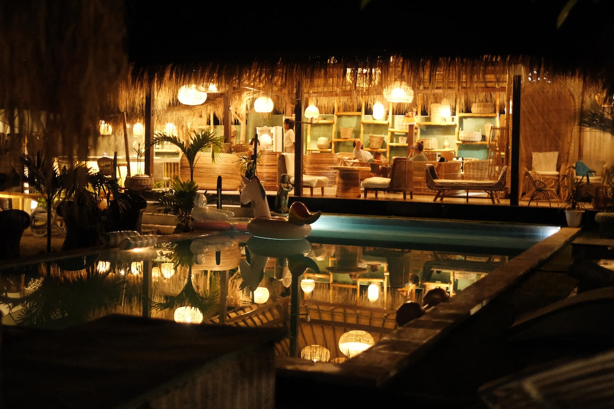 Il-Ġnien Shacks jikkonsistu f '6 shacks individwali kkundizzjonata bl-arja kkundizzjonata bi kmamar tal-banju en-suite u veranda privati. Għażla ta 'sodod doppji jew doppji, kumditajiet sbieħ tal-kamra tas-sodda u żona tal-pixxina komuni, kafetterija, bar u spa. Dan jinsab biss żewġ minuti mixi 'l bogħod mill-Klabb ta' Sandy Bay Beach magħruf sew, u huwa super post għall-vaganza tiegħek ta 'Nusa Lembongan. Tfal taħt l-10 snin mhux permessi. Kolazzjon mill-isbaħ inkluż fir-rata. Il-boutique sabiħa u s-sala nżul ix-xemx tagħna tlesti s-setting!