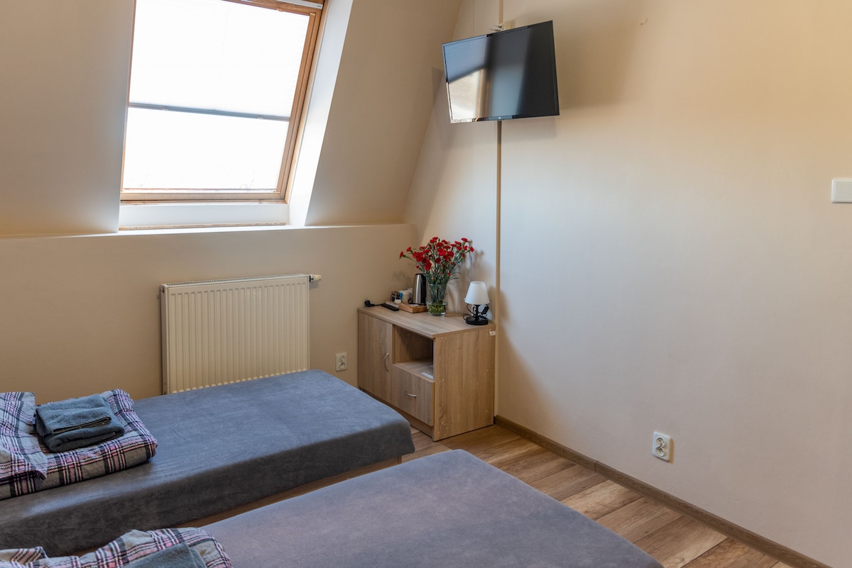 Aħna nistednuk fl-appartament tagħna. Għandu żona tal-irqad komda għal 6 persuni. L-appartament jikkonsisti f '2 kmamar tas-sodda b' żewġ sodod singoli kull wieħed (għall-konvenjenza tiegħek, aħna żgurajna li tista 'tgħaqqadhom f' sodod kbar, tiddeċiedi x 'għandek bżonn). Is-salott għandu sufan kbir b 'sodda doppja u TV bi skrin ċatt. L-appartament għandu kċina mgħammra b 'kollox (magna tal-ħasil tal-platti, magna tal-espresso, microwave, friġġ, forn) u kamra tal-banju b' doċċa u art imsaħħna.