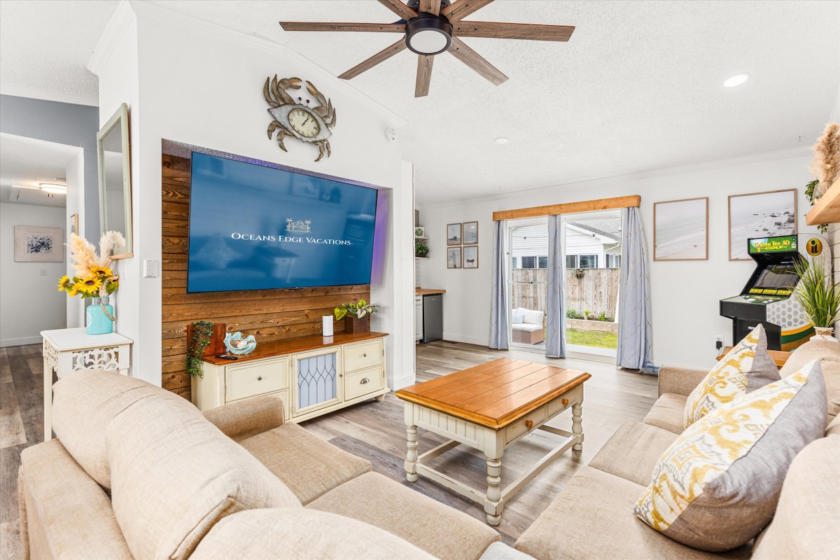 After relaxing at the beach (just a 7 min walk away), unwind on our deck "watchin' the tide rollin' away!" Get the best of the bay & the beach with this dog-friendly hidden gem! Imagine evenings enjoying the bay breeze as you crack crabs on the deck! Relax inside our open-concept great room that allows everyone to be together. Fish on our private dock or use it for your own boat or jet-ski to dock there. Witness spectacular sunsets with our Kayaks. Enjoy a well lit, private work space to virtual work w/ high speed internet! A new wood CRIB now in master suite for restful sleep! The pools and tennis/pickleball courts are only a few blocks away for your enjoyment! Plus, a truly unique OUTDOOR MOVIE EXPERIENCE for all our guests to make for the best Vacay EVER!