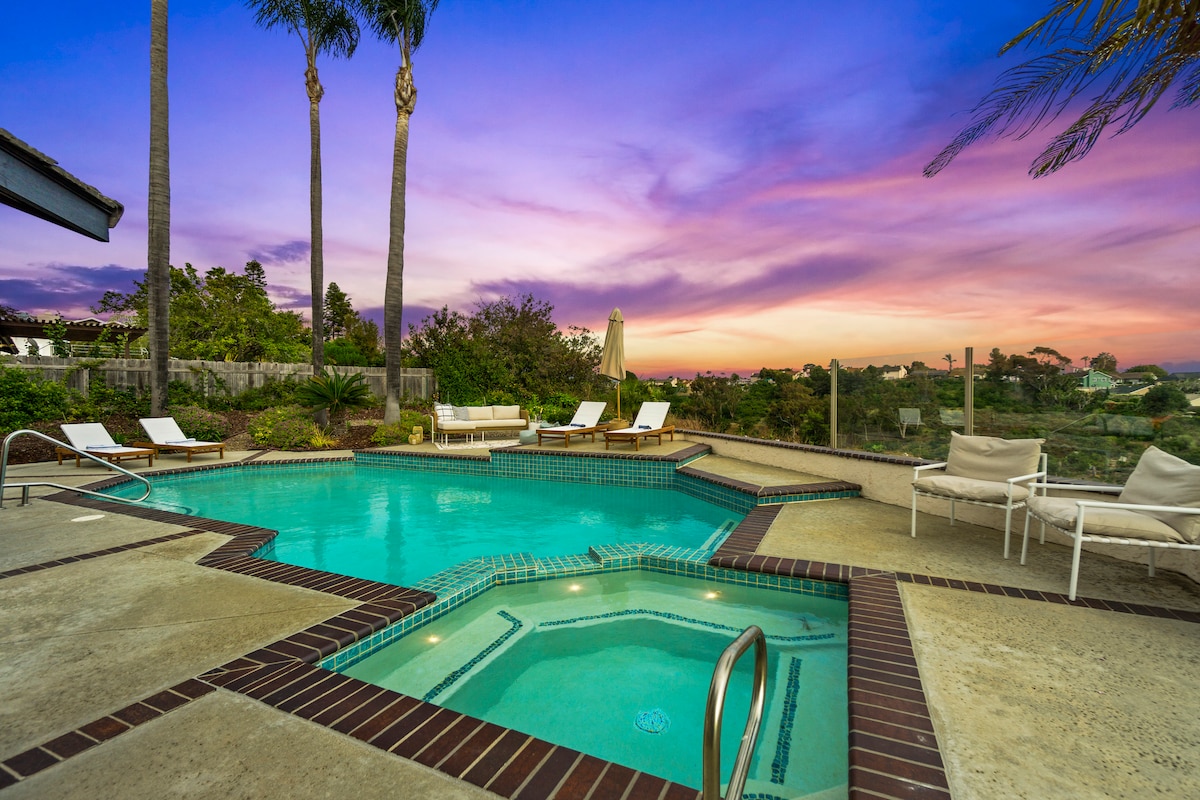 Irrilassa f 'din il-ġawhra moħbija li għadha kif ġiet irranġata u eleganti b' tarzna privata b' veduta tal-oċean f' pixxina u jacuzzi mibnija apposta. Gawdi l-istil ta 'resort tal-vaganzi tiegħek imdawwar b' siġar tal-palm u siġar tal-frott f' ġenb l-għoljiet iżolati biss 7-10 minuti' l bogħod mill-bajja u l-aqwa attrazzjonijiet fil-Kontea ta 'San Diego tat-Tramuntana. Id-disinn modern tal-Iskandinavu kostali jippermettilek tgawdi l-mod tiegħek kif terġa 'tiġbed il-lussu. Id-dar hija mibnija apposta ddisinjata għall-aħjar dawl u tista 'tara kemm Sunrise kif ukoll Sunset!