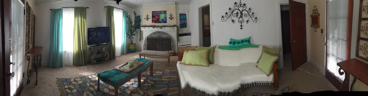 Il-Bungalow ta' Buenaventura jinsab fiċ-ċentru tad-distrett popolari ta' Ventura f' nofs il-belt fuq triq wiesgħa u kwieta. Ħames minuti 'l bogħod mill-bajjiet/miċ-ċentru. Irrestawrajna b' imħabba dan il-faxxinu tal-1925 li jgħaqqad id-dettalji klassiċi ma' bitħa privata tal-istil modern. Ħafna dawl naturali. Bdrm 1: sodda u skrivanija king. Bdrm 2: sodda doppja 'queen'. Il-kamra tal-banju għandha madum vintage vibe/b&w. Kċina mgħammra b' cooker klassiku O'Keefe u Merritt. Gawdi l-ikel al fresco, terrazzin tal-ġebel tal-bandiera; BBQ tal-gass. Parkeġġ barra mit-triq. Slps 4.