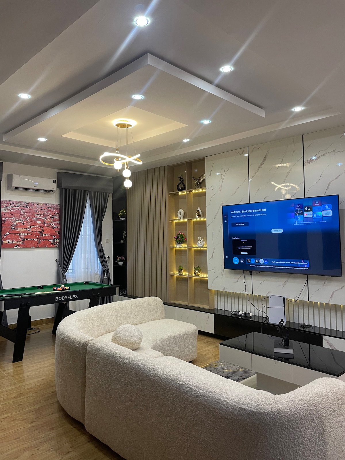 Ħarba lejn l-oażi kwieta ta' Olumide fil-qalba tal-belt! L-appartament lussuż tagħna bi 3 sodod b' 33Kva Transformer jiggarantixxi provvista tal-elettriku mingħajr interruzzjoni. Irrilassa bl-istil permezz tal-plush king size tagħna u żewġ postijiet fejn toqgħod ta' daqs queen, kull waħda b' kmamar tal-banju en-suite, għall-kumdità aħħarija. Żomm kuntatt b' Wi-Fi veloċi, b' ġeneratur standby! u Netflix bl-ismart TVs 65 u 42"tagħna, kċina mgħammra b' kollox u gallariji privati. Ideali għaż-żjarat fit-tul, għall-familji u għall-gruppi. Ibbukkja issa u rrilassa fl-istil