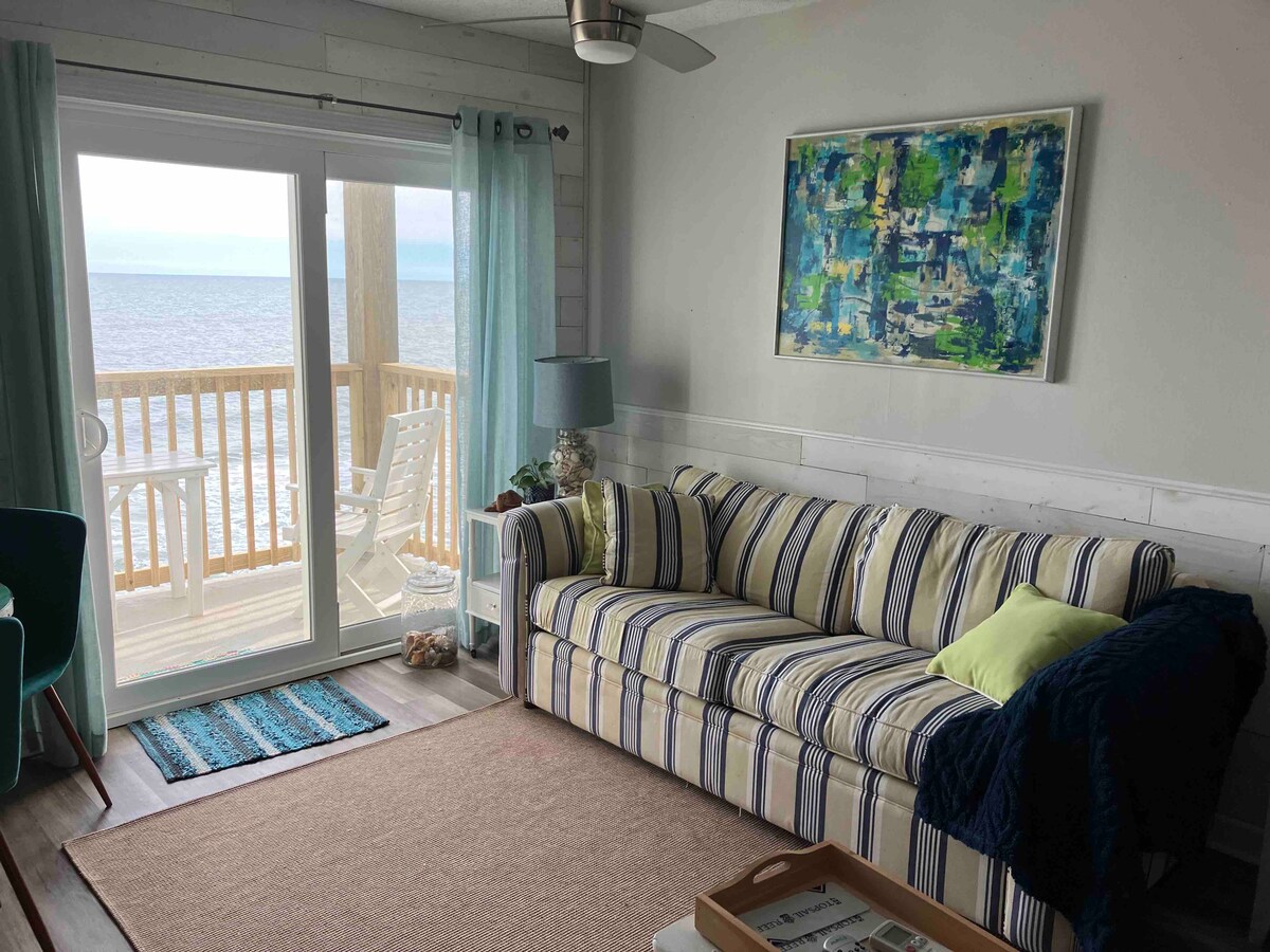 Baħar lilek innifsek hawn. 34.4902N lonġitudni, 77.4136W latitudni. Veduti sbieħ tal-oċean mill-kċina, mis-salott u mill-gallarija. Ġdid frisk makover 1 sodda/banju 1 condo oċeanfront. Jorqod 5 (1 sodda reġina, 1 bunk (kbira għall-gidjien) Couch bi sleeper tewmin. Kejbil bażiku ta '50" smart flatscreen TV Lożor u xugamani pprovduti Kċina sħiħa - Jekk jogħġbok naddaf u neħħi l-borom u t-twaġen mat-tluq Magna tal-ħasil/dryer kompluta fuq il-post Grills fuq il-post Aċċess għall-bajja Ħin taċ-check-in 3 pm Check-out 12 pm