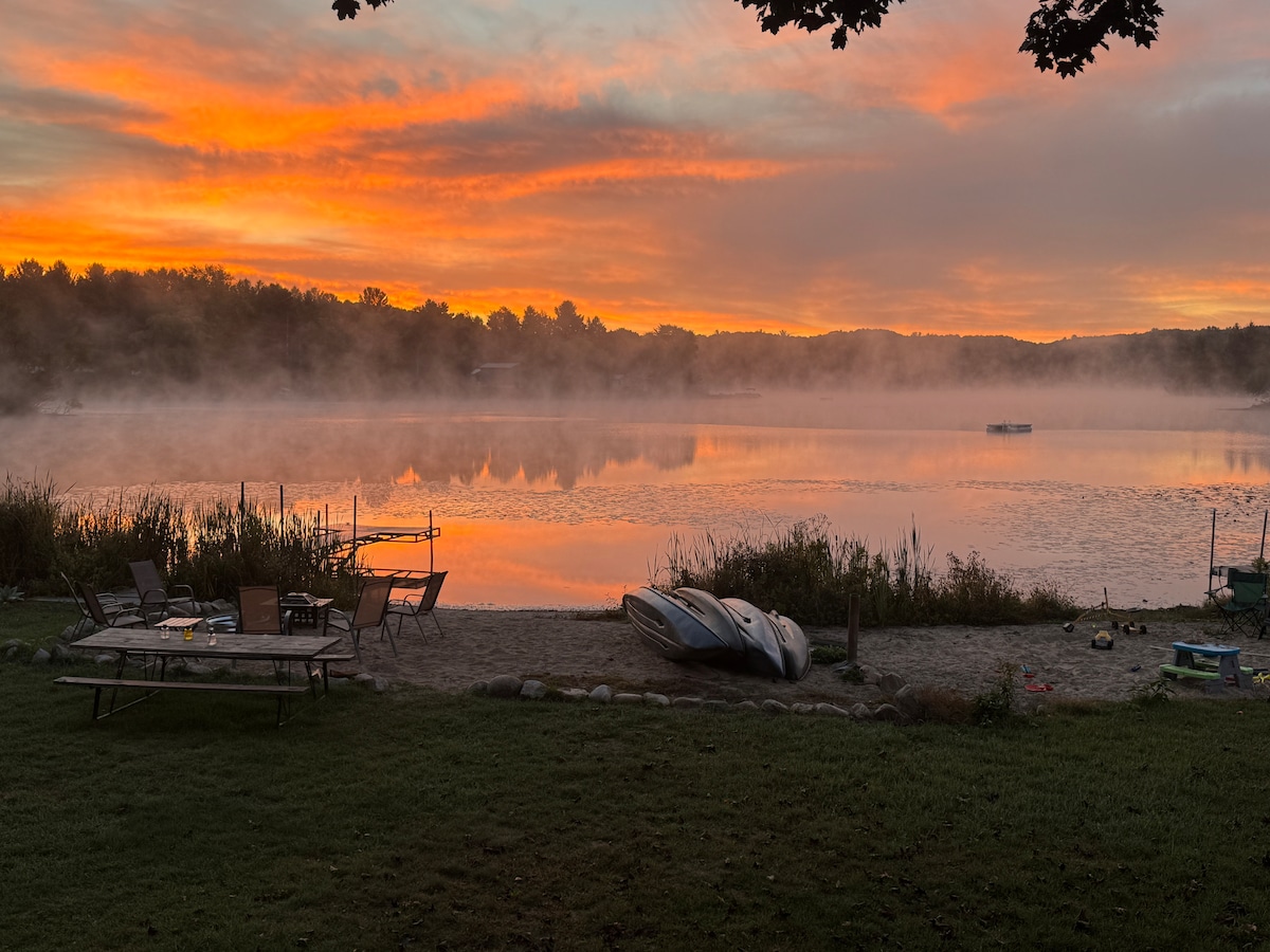 Cottage faċċata tal-lag magħluqa - fossa tan-nar, kayaks.
