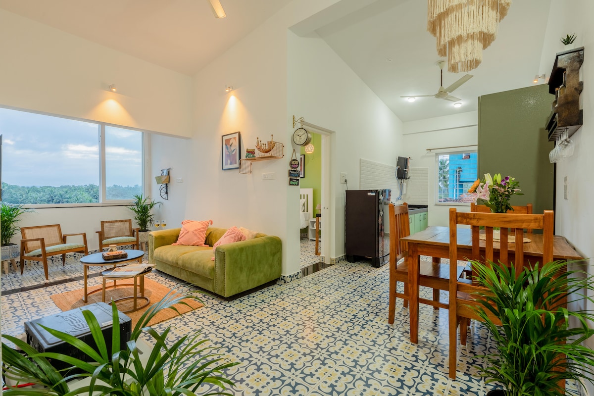 Merħba f'Perch – The Nook, Goa. 1BHK kalma u arjuża moħba ħdejn ħaxix li jitbandal. Kemm jekk ġejt waħdek, mal-ħbieb, mal-familja jew mal-pets tiegħek — dan huwa post għalik biex tistrieħ u tnaqqas ir-ritmu tal-ħajja. Oħroġ fuq it-terrazzin privat tiegħek, daħal fil-jacuzzi u nsa l-bqija tad-dinja għal ftit. Fuq ġewwa, is-sufan komdu u l-atmosfera sabiħa jagħmluha faċli biex tistrieħ u tħossok komdu. Post fejn il-għodwiet ikunu iktar ħelwin, il-iljieli ikunu iktar kwieti u kull mument ikun perfett.