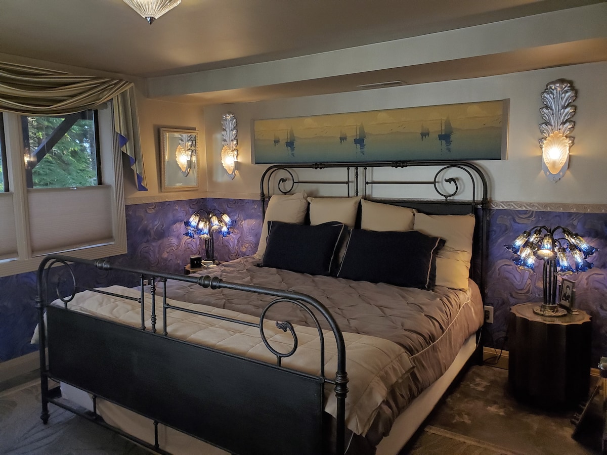 Stunningly Beautiful Ocean View, No Cleaning Fee, Cozy Oceanfront Cottage Apt, overlooking the Pacific Ocean. Private Balcony, chairs and (Electric BBQ summer only). Main room has a King Bed with Kitchenette ,Electric Fireplace, Sofa , Peacock TV and dining table. There is a Bathroom with Shower, Bedroom has a Queen Bed and minifridge/freezer. Kitchenette has salt,pepper,oil, utensils,dishes,cookware,mini oven,Instapot,toaster microwave, Minifridge, two burner stove, drip coffee maker.