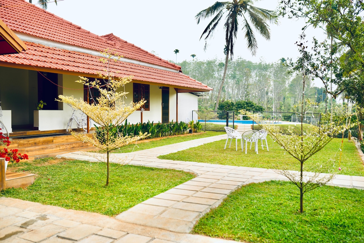 Merħba f'Ethnic Villa – Premium Family Cottage, villa lussuża, spazjuża u mfassla b'mod mill-isbaħ li toffri post fejn tistrieħ fil-qalba ta' Wayanad, qrib it-Tempju ta' Angadissery, Manalvayal, Irulam, Kerala. B'differenza mix-chalets b'forma ta' A tagħna, din il-cottage għandha stil arkitettoniku klassiku u eleganti — perfetta għal familji żgħar jew koppji li jixtiequ iktar spazju, kumdità u privatezza. Gawdi s-sbuħija naturali ta' Wayanad u l-kumditajiet ta' kwalità għolja u l-ospitalità sabiħa.