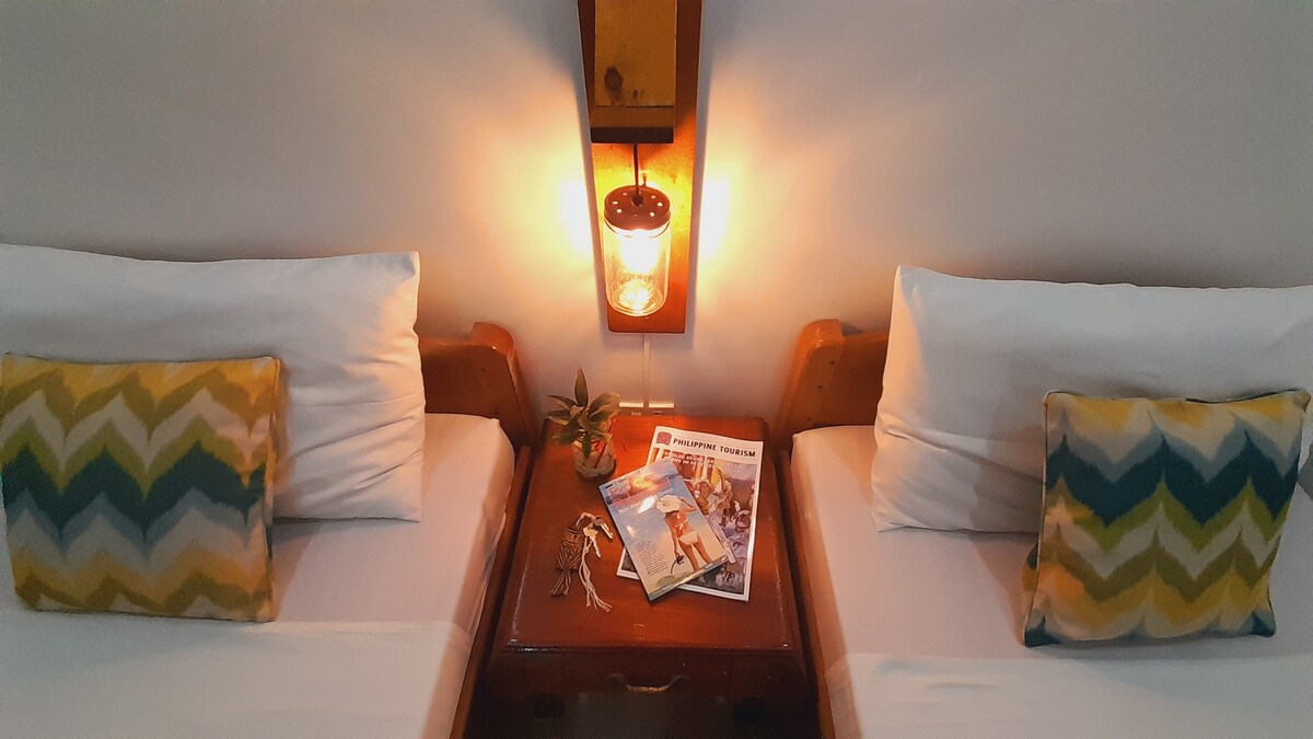 Fully air conditioned spacious room with 1 queen size bed and 2 single beds, private bathroom with hot and cold water, private balcony (overlooking El Nido town, El Nido cliff and Cadlao island), flat screen LED TV, a deposit box and a hairdryer.