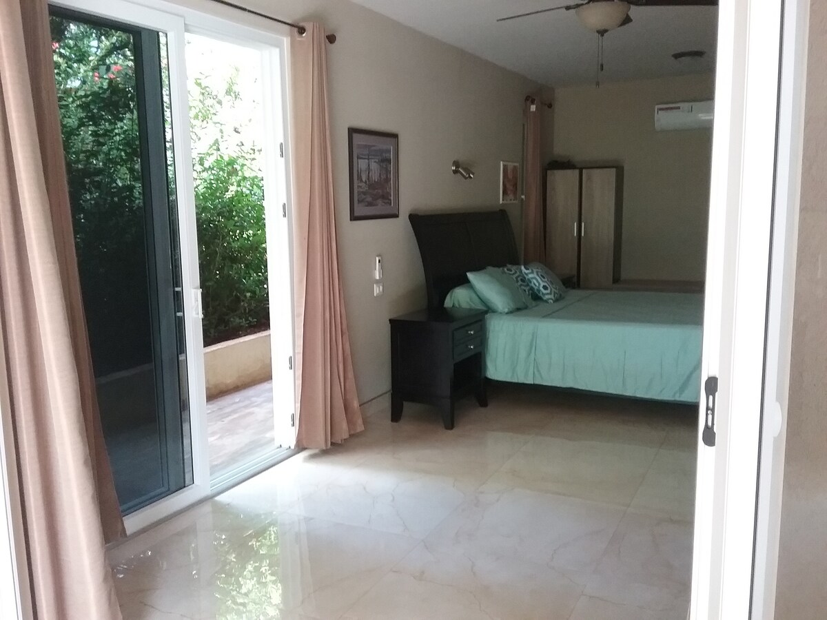 Directly on 1 Km sandy beach. STARLINK internet. Next to Surfing Beach. This suite has its own private entrance/large King Bed with beautiful wood furniture from the USA. Access to a stainless steel BBQ with 2 burner stove, a sink and large granite countertop to use as your fancy 'outdoor' kitchen. Dishes, pots and pans provided. Set in a beautiful, rich jungle with lots of wildlife. Pool directly off the large terrace. The ocean is warm, calm for swimming and some days great for body-boarding.