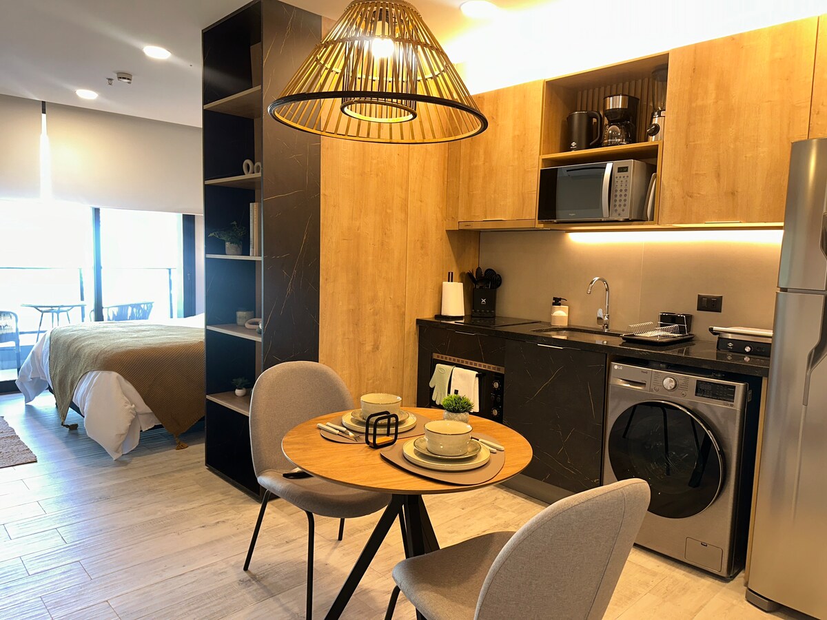 Appartament modern fi studio f' waħda mill-aqwa żoni. Nofs blokka 'l bogħod minn Shopping del Sol, 3 minuti' l bogħod minn Paseo La Galería u 12-il minuta' l bogħod mill-ajruport. Aċċess ħafif għal ristoranti/supermarkets/uffiċċji. Għandu sodda Queen, Smart TV, arja kkundizzjonata, WiFi, kċina mgħammra b' kollox u gallarija privata. Aċċess għal żoni komuni bħal spazju ta' coworking, kamra tal-ħasil tal-ħwejjeġ, pixxina, gym, sawna u spa. Il-parkeġġ mhux inkluż, iżda jista' jinkera fil-bini għal $ 10 USD kuljum, skont id-disponibbiltà.
