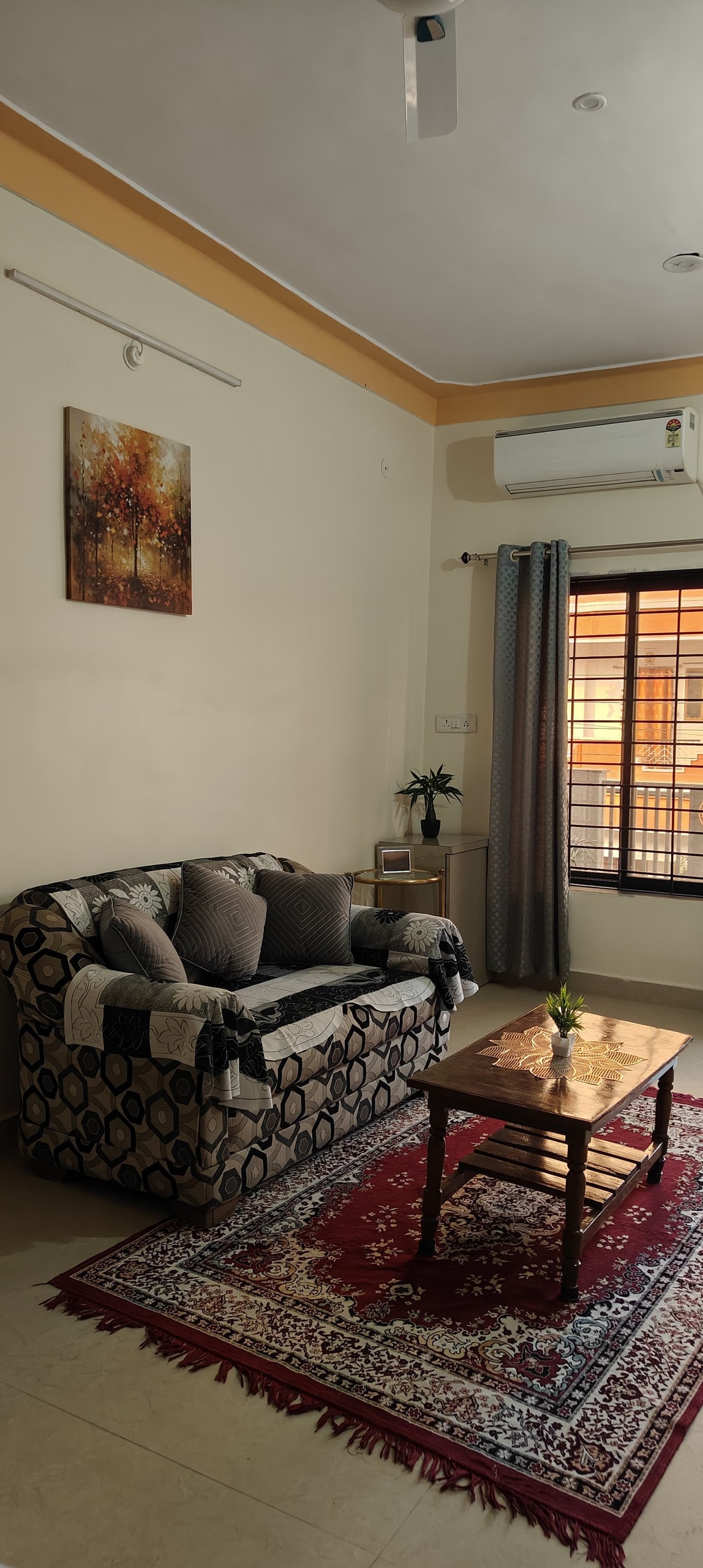 1BHK Airbnb ġewwa Bittan Market, Bhopal Salott: Sufan komdu, mejda fin-nofs, skrivanija tal-uffiċċju u siġġu, TV, pjanti Kamra tas-sodda: Sodda king-size, mera b' ħajt sħiħ, ħażna wiesgħa, AC Kċina: Friġġ, microwave, kitla, induzzjoni, cutleries u għodod, purifikatur tal-ilma Kamra tal-ħasil: Moderna b' prodotti tal-indafa personali pprovduti Spazju fuq barra: Postijiet fejn toqgħod bilqiegħda b' mejda tal-kafè Apparat: Magna tal-ħasil, microwave, friġġ, kitla, induzzjoni, AC, TV, WiFi