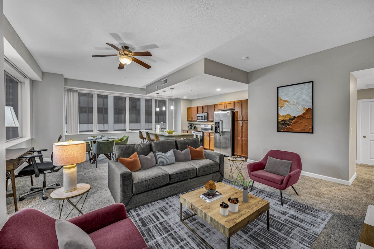You can stop your search now. You just found the perfect place to book for your trip to Cleveland. ➹ Clean. Robust Amenities. Modern Finishes. Quick Host Responses. ➹ You're going to be located at the CENTER of everything in Downtown Cleveland. ➹ Get a good night's sleep with our memory foam beds. ➹ Spend your daytime working from home at our private home office. Cook a meal for your group in our beautiful, timeless kitchen. Then spend your evenings relaxing with our 65" Smart TV.
