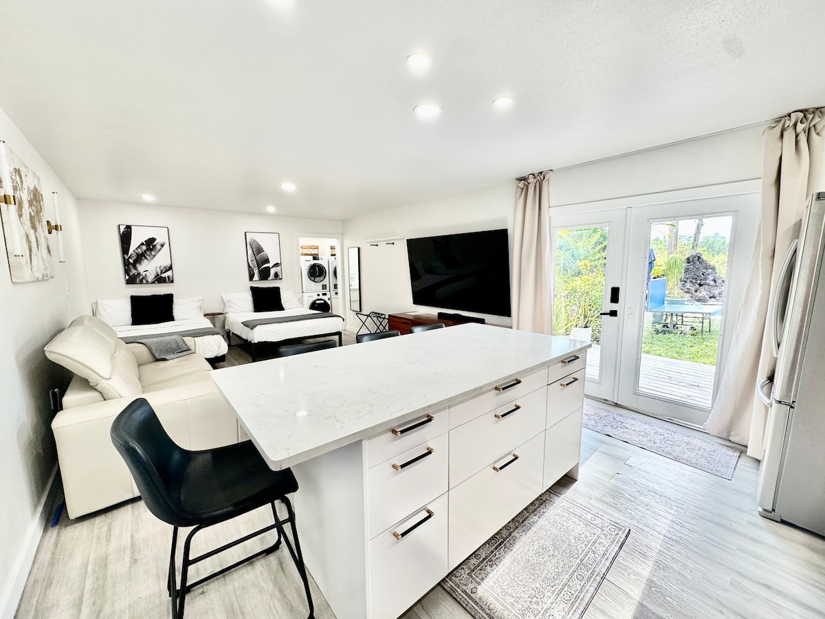 Studio privat b' doċċa tax-xita, magna tal-ħasil/dryer ġewwa unità (deterġent inkluż), Smart TV w/ Roku & Netflix, u bar tal-kafè stokkjat b' kafè, zokkor u krema. Il-kċina żgħira tinkludi microwave, friġġ, platti, għodod u ħwawar. Sodda queen, sufan komdu, A/C kiesħa u Wi-Fi veloċi. Daħla privata f' viċinat kwiet u sigur. Ideali għal xogħol mill-bogħod, żjarat twal jew vaganzi qosra. Nadif, funzjonali u faċli biex toqgħod fih. Ħafna parkeġġ.