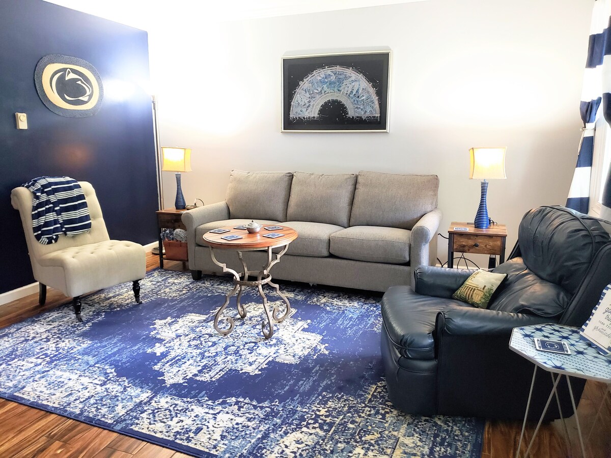 Your spacious private suite will easily sleep 4 people. Bedroom with full bed, Sleeper-Sofa in livingroom, folds out to full bed, and twin cot available. Serene setting Located 4 miles from Beaver Stadium & Bryce Jordan Center. Two night minimum PSU game weekends. Take time to enjoy what Happy Valley has to offer, & take time to relax while you experience the peaceful setting of your location. Bus stops on street corner near rental. Absolutely NO SMOKING