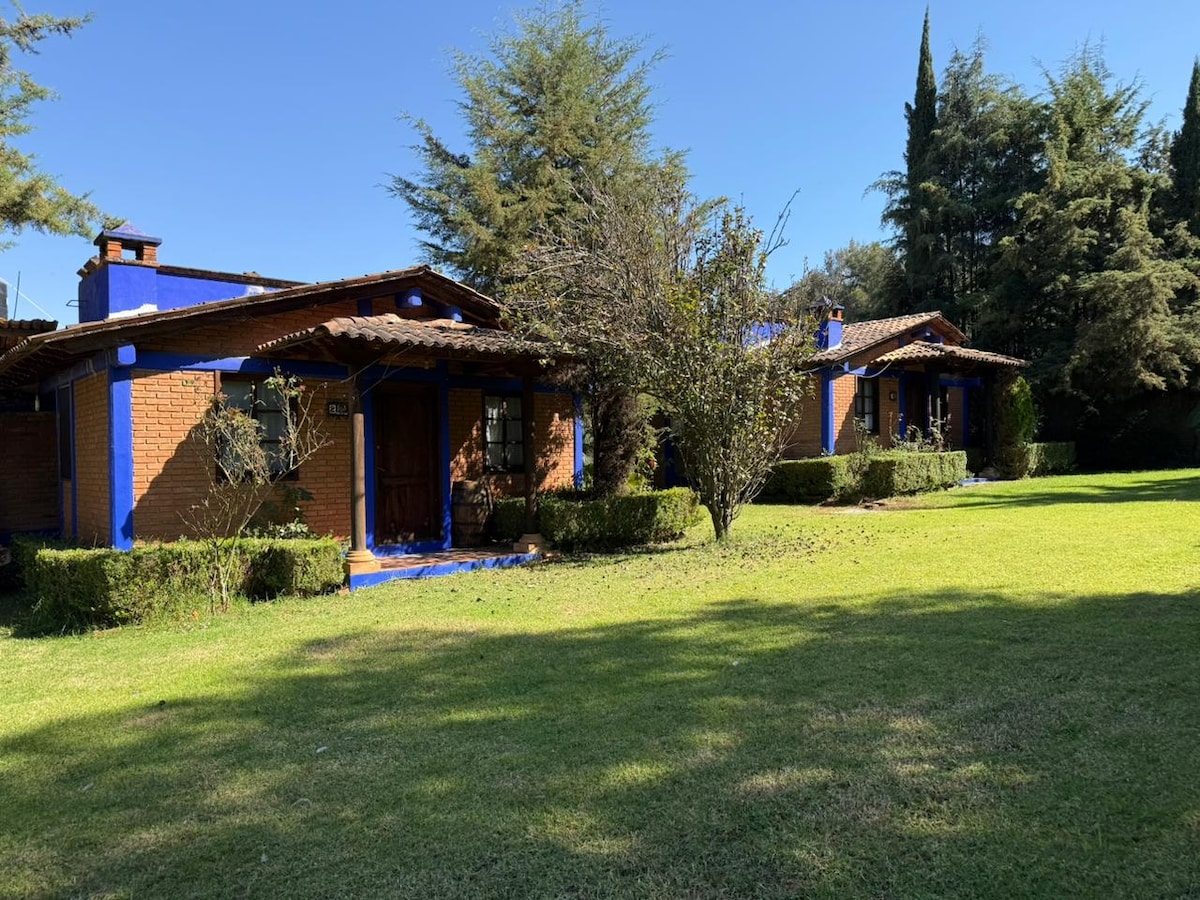 Kabina tal-injam komda u komda, tat-tip alpin, imdawra bin-natura. Bħala koppja jew mal-familja kollha, tista' tgawdi 3300 m2 ta' ġonna, logħob għat-tfal, hammocks, barbecue, fire pit, kamra tal-avvenimenti b' kmamar tal-banju indipendenti. U cottage mgħammra b' kamra tas-sodda king size, fireplace, kċina sħiħa, kamra tal-banju sħiħa, TV 48”u WIFI. Dan kollu 10 minuti 'l bogħod miċ-ċentru ta' Pátzcuaro.