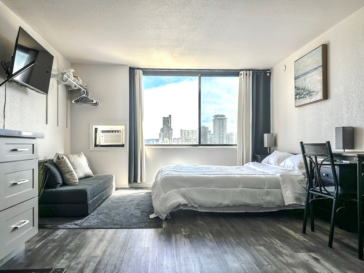 Studjo mġedded li jinsab fiċ-ċentru ġewwa Waikiki, turġien mill-ikel, mix-xiri u mixja qasira sal-bajja. Mgħammar b' sodda qies queen, sedil tal-imħabba u spazju apposta għax-xogħol. Spazju għall-parkeġġ bla ħlas inkluż f' garaxx mgħotti. IL-WIFI, l-ismart TV, l-arja kkundizzjonata, Keurig, il-banju fil-fond u t-toilet bidet Ġappuniż huma xi kumditajiet mill-aqwa. Lanai b' postijiet bilqiegħda u veduta. Dan l-ispazju maħsub biex jgħix fit-tul, huwa ideali għal żjarat qosra jew twal.