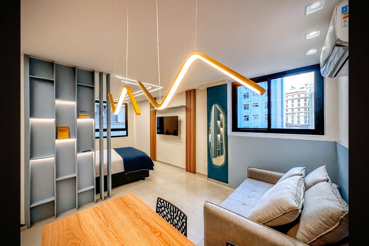 Studio moderno de 37 m² no SEND Coliving, perfeito para até 4 pessoas. Equipado com cama queen, sofá-cama de casal, cozinha completa e Wi-Fi gratuito. Condomínio com lazer completo: rooftop com espelho d'água e área gourmet, academia, sauna, coworking, salão de jogos e lavanderia. Localização estratégica no Centro: Fica a 5 minutos do metrô Carioca e 5 minutos do metrô e VLT Cinelândia. Com fácil acesso a Copacabana, Ipanema e Leblon. E menos de 10 minutos a pé da Petrobrás , BNDES e Lapa.