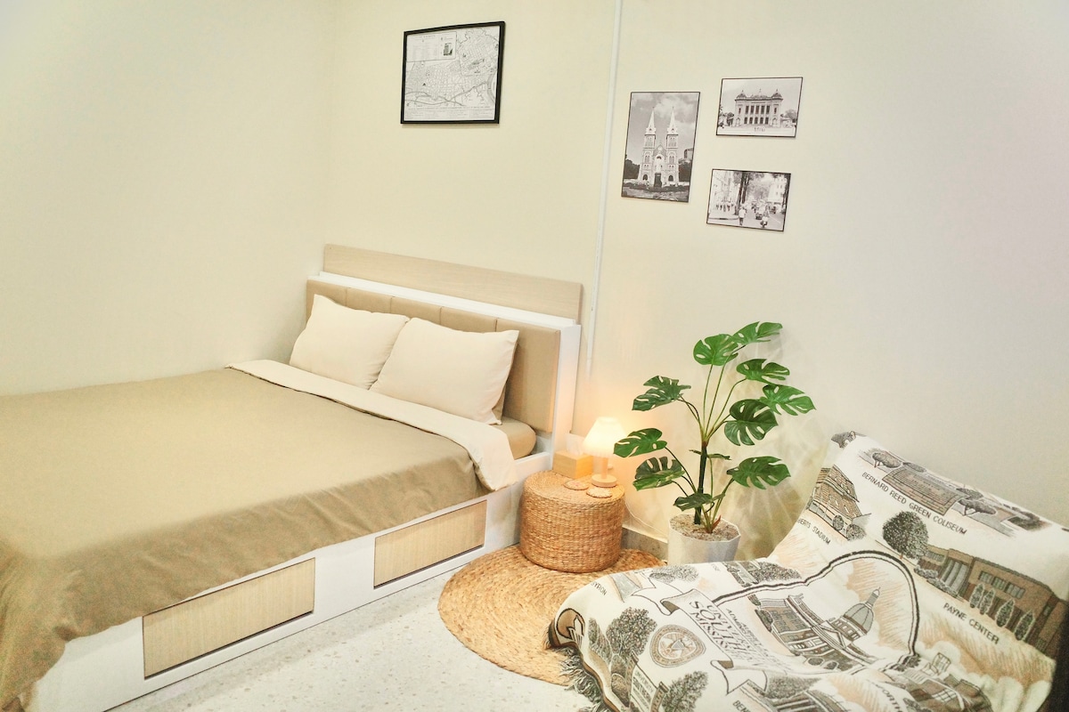 Appartament ta' studio b' disinn uniku li jinsab f' alloġġ sabiħ fiċ-Ċentru ta' Saigon. L-istudjo jinsab fit-tieni sular ta' townhouse, li l-ewwel sular tiegħu huwa l-kafè sabiħ BeanThere. Tieħu biss ftit minuti biex tilħaq l-attrazzjonijiet u l-attivitajiet tal-ħajja tal-lejl. Barra minn hekk, hemm ukoll kċina biex issajjar ikliet bażiċi. Kolazzjon wieħed (01 ikel u 01 xarba) / klijent / lejl fil-kafè Beanthere. Aħna noffru tindif tad-dar bla ħlas għal bookings itwal minn 4 iljieli. Jekk ikun hemm bżonn, tista' tavża jum bil-quddiem.
