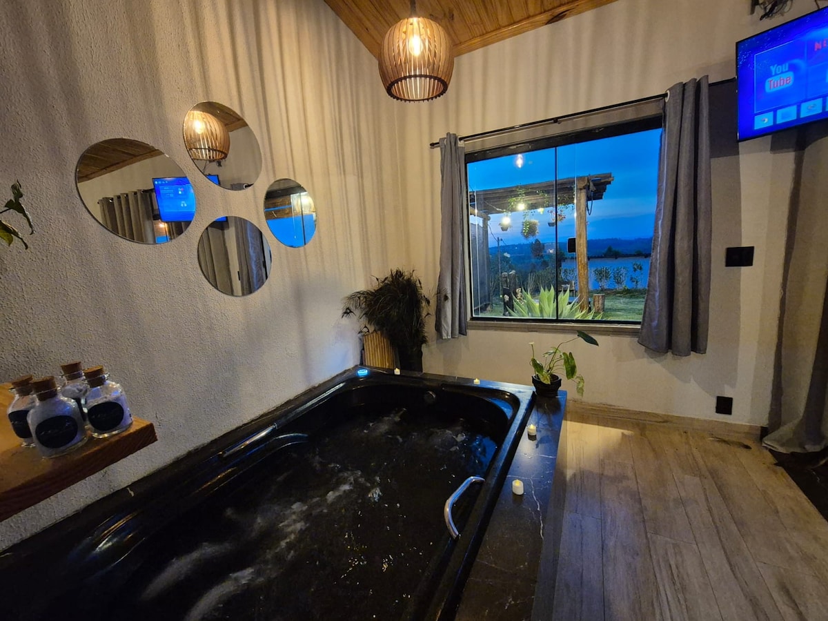 Na reserva de 2 diárias o vinho é nossa cortesia! Chalé no Topo da Montanha com Vista Incrível para o Pôr do Sol e Fogueira para o Luar. Desperte com o canto dos pássaros, termine o dia com um pôr do sol inesquecível e curta à fogueira com vinho e marshmallows. Estamos no topo da montanha, rodeado por flores e natureza exuberante, perfeito para quem busca paz e momentos especiais. Relaxe na banheira de hidromassagem aquecida com vista para as montanhas. Panela de fondue e cozinha equipada
