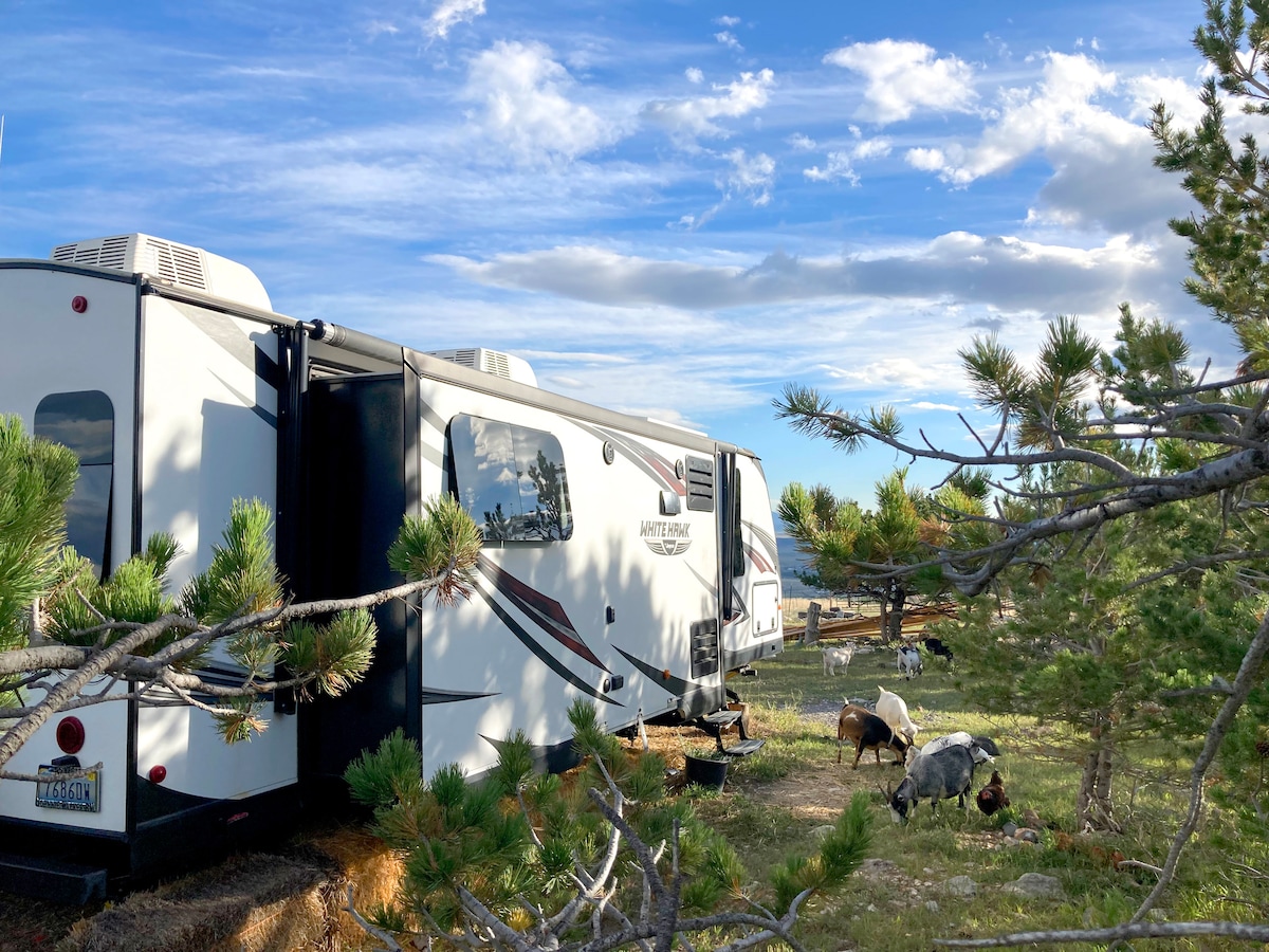 Irkupra għal din il-vettura moderna ta' rikreazzjoni 27'jew gawdi l-jacuzzi ożonati li tagħti fuq il-wied tal-ġenna u d-daħla maestuża għal Yellowstone. Dan ir-razzett ta' 10 ettari ta' fejqan joffri l-maġija li tħares lejn l-istilel taħt is-sema tal-lejl tleqq, veduti bla preċedent, mistrieħ u ħin tal-logħob ma' mogħoż amikevoli. 6 minuti biss 'il bogħod mill-belt, ejja logħob u fejqan fir-RV tal-oażi privata tiegħek li jorqdu 5, bi kċina u kamra tal-banju sħiħa, wifi b' veloċità għolja, kafè, te, arti mill-hosts tiegħek u dak kollu li għandek bżonn biex issajjar jew taħmi!