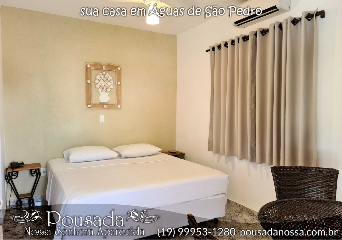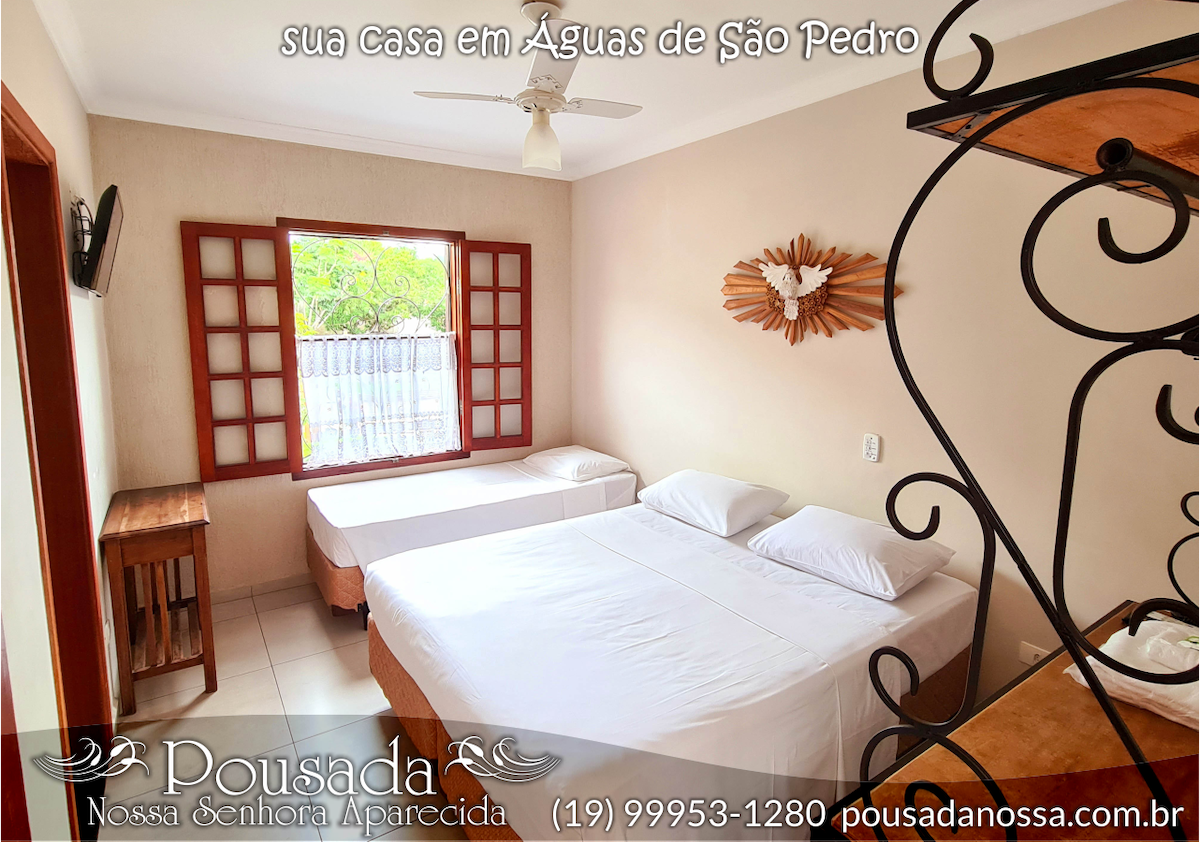 Suíte para família ( 5 pessoas), contendo ar condicionado, smart tv, frigobar e varanda privativa. Incluso nosso delicioso café da manhã Pousada localizada no centro de Águas de São Pedro. Temos parceria com o Thermas Water Parque, que fica à 5km de nossa localização.