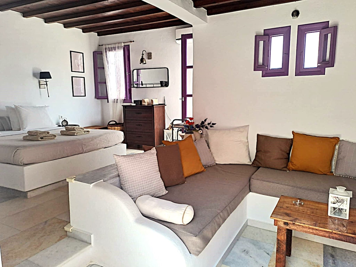 Appartament estetiku uniku b' terrazzin privat sabiħ u ħafna affarijiet tal-arti, li jinsab f' viċinat piktoresk fil-qalba tal-Belt ta' Naxos li jista' jilqa' sa 5 klijenti. Jinsab 10' bil-mixi mill-Port, 1'-2' mis-Suq u postijiet oħra ta' interess (kastell, mużewijiet, eċċ) u divertiment (bars, ristoranti, eċċ). Jekk tivvjaġġa mingħajr karozza, tinkwetax; l-eqreb stazzjon tal-karozzi tal-linja għall-iktar bajjiet u rħula popolari huwa 3' bil-mixi. Spazju għall-parkeġġ bla ħlas fit-3'bil-mixi!