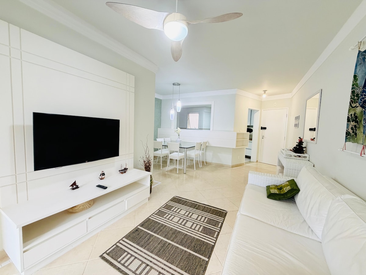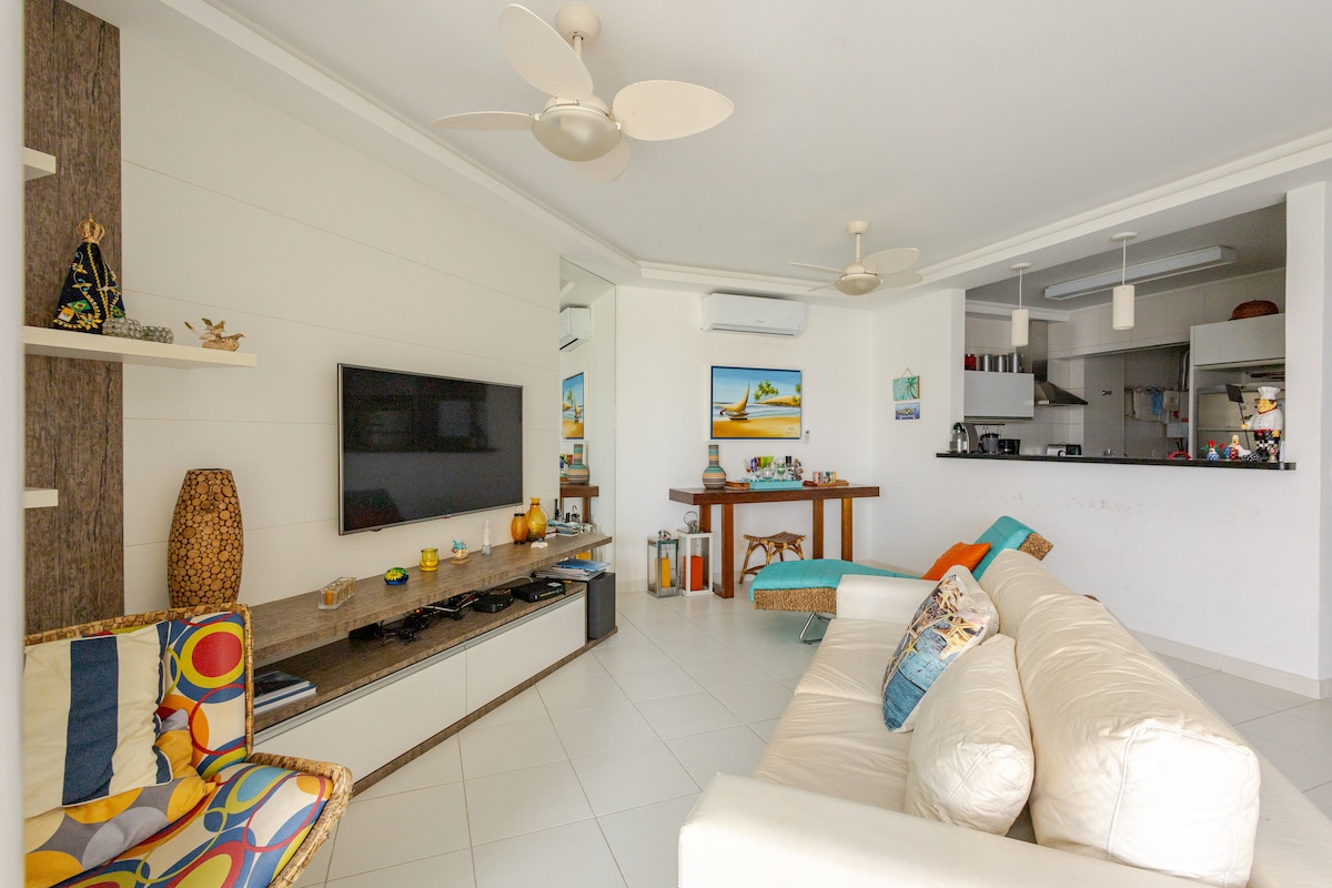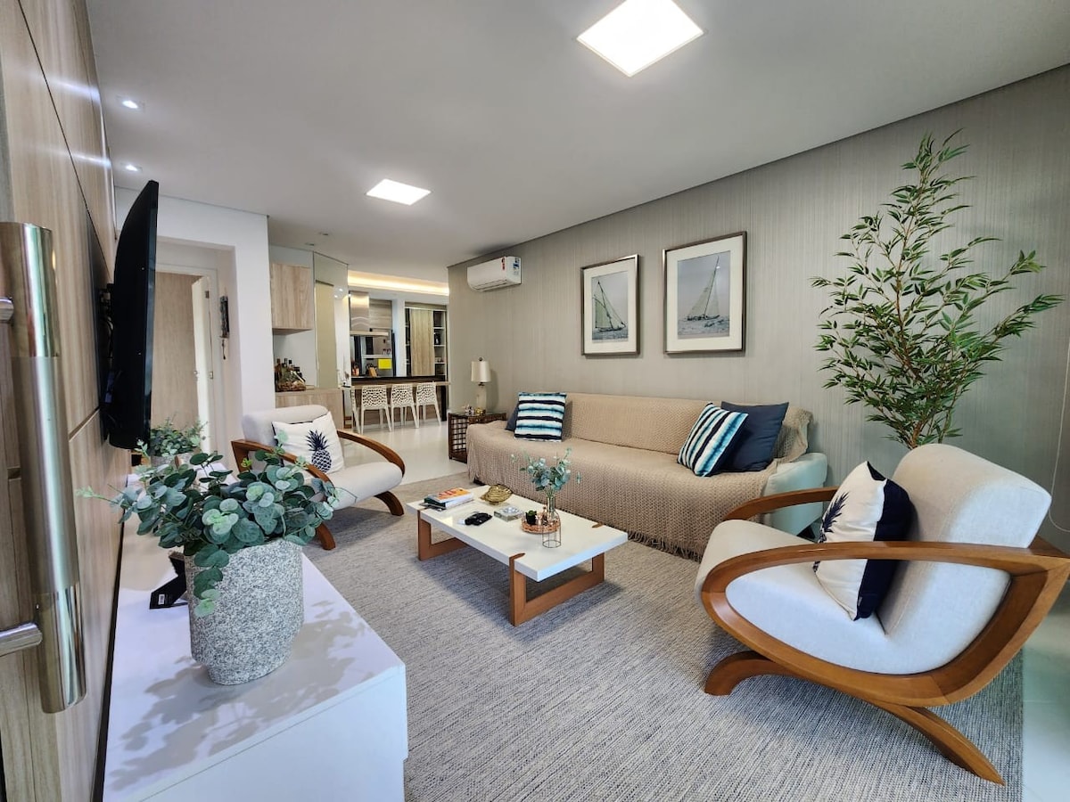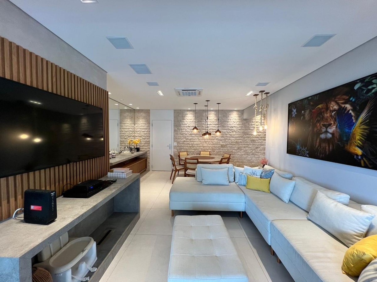 Apt Module 8 Cond. Home-Resort 100m mill-bajja, 95m2, 2 spazji , 3 dormitorji (1 suite), kamra tal-ikel, salott/TV intelliġenti ta '65 pulzier, TV bil-kejbil ( Net Claro ), Wifi , aċċess għall-gallarija gourmet. Arja kkundizzjonata fl-ambjenti kollha. Cooktop mgħammra fil-kċina, barnuża, forn tal-elettriku, microwave, Air Fryer, magna tal-kafè, friġġ duplex, countertop tal-granit. Żona ta 'servizz b' magna tal-ħasil, Tisħin bil-gass fid-doċċa. Servizz fuq il-bajja, sunshade u 4 siġġijiet. Aħna ma nipprovdux bjankerija tas-sodda u tal-banju.