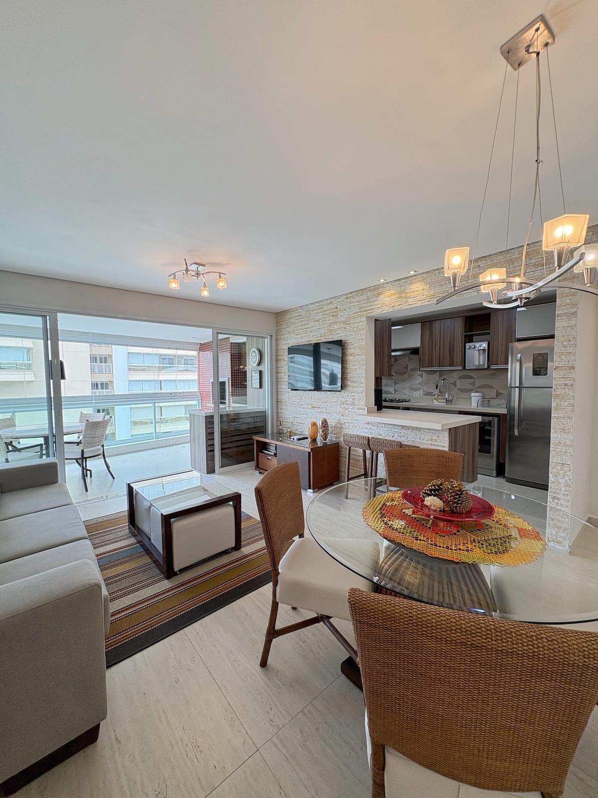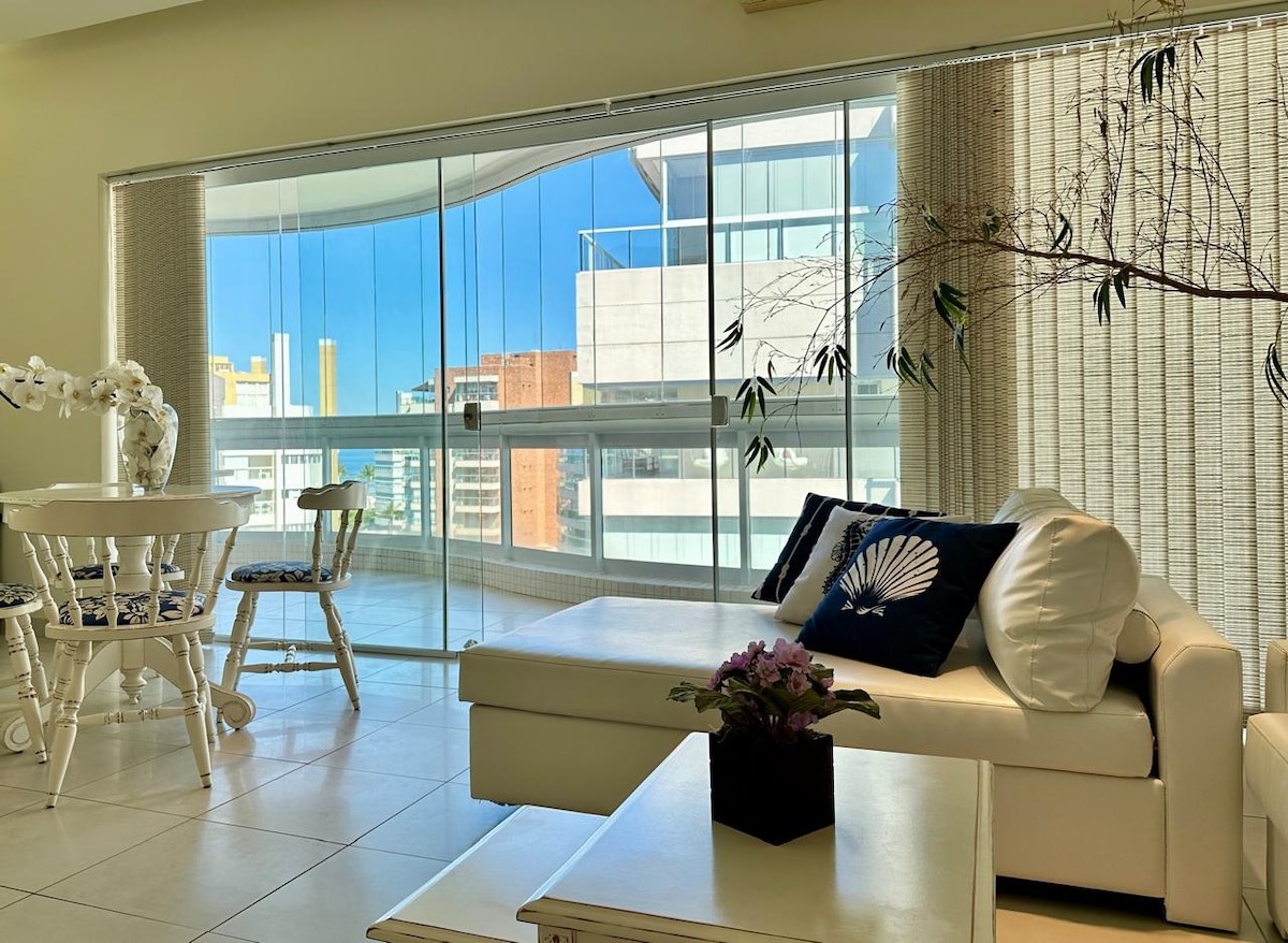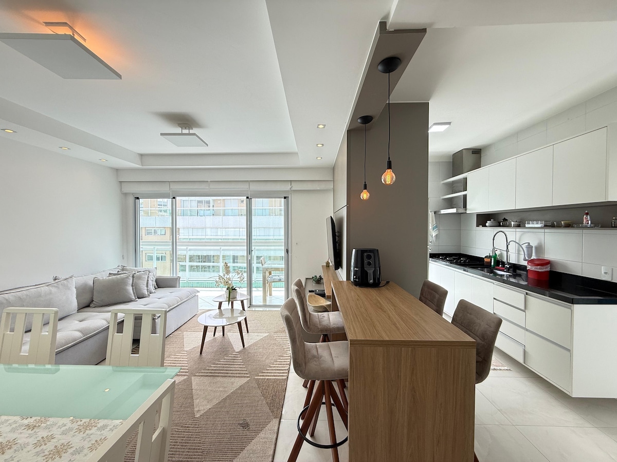 Apt Module 8 Cond. Home-Resort 100m mill-bajja, 95m2, 2 spazji , 3 dormitorji (1 suite), kamra tal-ikel, salott/TV intelliġenti ta '65 pulzier, TV bil-kejbil ( Net Claro ), Wifi , aċċess għall-gallarija gourmet. Arja kkundizzjonata fl-ambjenti kollha. Cooktop mgħammra fil-kċina, barnuża, forn tal-elettriku, microwave, Air Fryer, magna tal-kafè, friġġ duplex, countertop tal-granit. Żona ta 'servizz b' magna tal-ħasil, Tisħin bil-gass fid-doċċa. Servizz fuq il-bajja, sunshade u 4 siġġijiet. Aħna ma nipprovdux bjankerija tas-sodda u tal-banju.