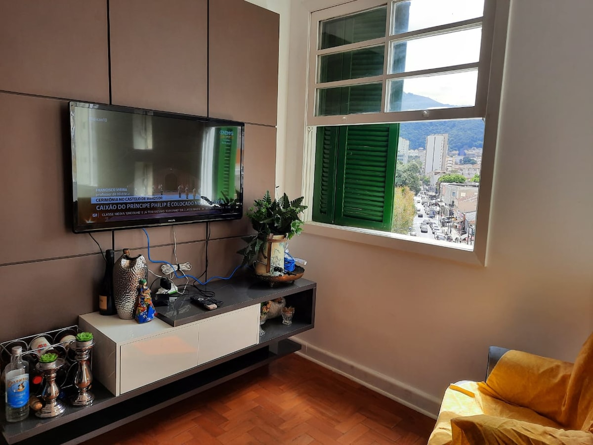 Dan l-appartament, li jappartjeni lill-familja għal aktar minn 50 sena, issa rinnovat, jieħu ħsieb lil kulħadd immedjatament. Quddiem, il-muntanja ta' Christ the Redeer, b' bijoma predominanti tal-Foresta tal-Atlantiku; taħt, il-Baths Antônio Carlos, bl-ilmijiet tagħha li għandhom is-saħħa tal-fejqan, u l-ġonna imposti tal-pjazza ċentrali. Mit-tieqa tal-kamra tidher il-moviment tal-belt. Kafetteriji, ristoranti, ħwienet tal-ħobż, supermarkets, parkeġġ u diversi ħwienet jistgħu jiġu frekwentati bil-mixi.
