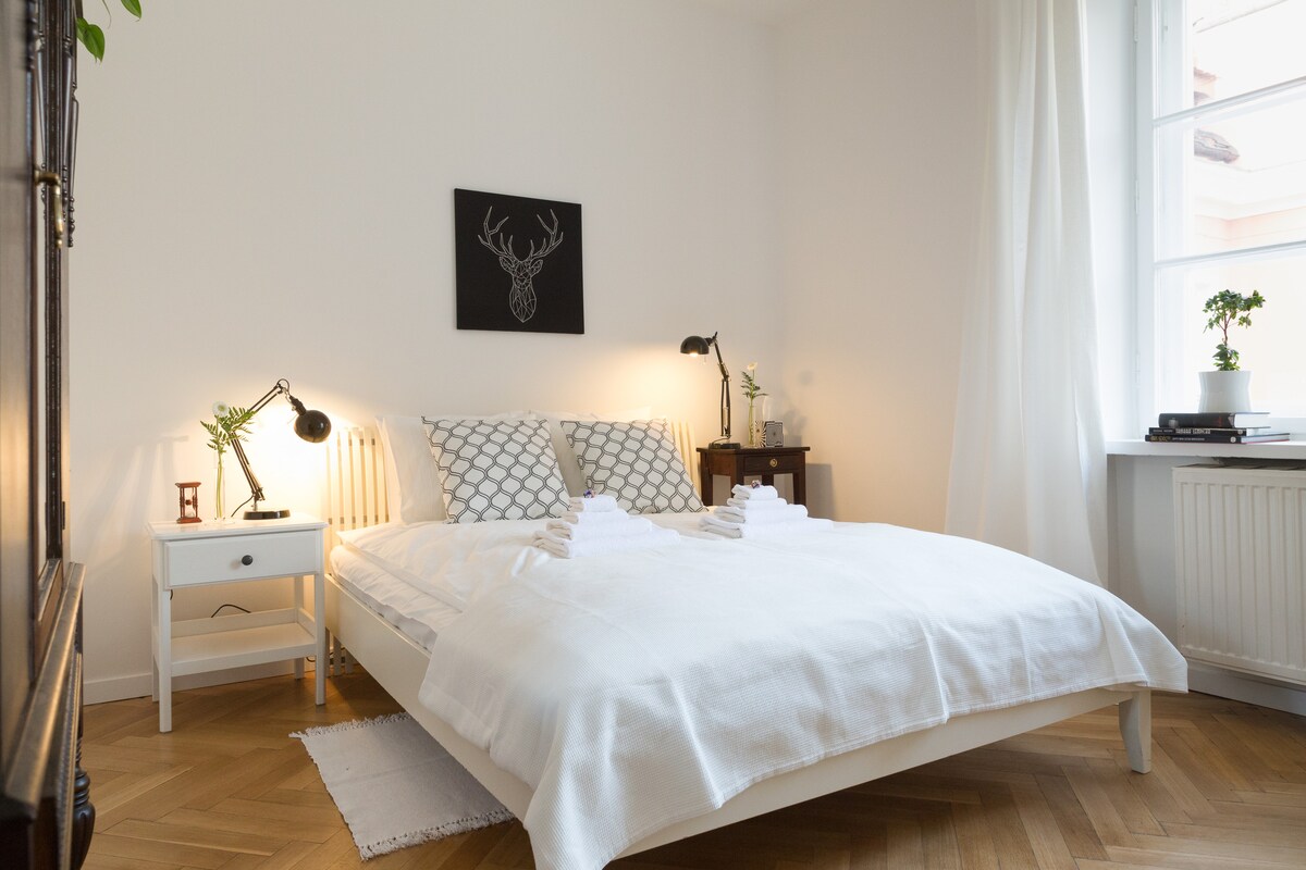 Erġa 'ixgħel sufan tal-kabriol antik f' żona tal-għajxien mimlija dawl imżejna b 'twapet tal-ġilda tan-nagħaġ u għamara vintage. L-aċċenti upcycled u r-ritratti minimalisti kollha jagħtu ambjent eklettiku għal dan l-ispazju mmudellat mill-ġdid. L-appartament jinsab f' tenement house tas-seklu 19, fid-Distrett tal-Belt il-Qadima bejn il-Pjazza Ewlenija u ż-żona l-qadima tal-Kwartier Lhud. Mixja fit-toroq b' dehra speċjali b' ħwienet tal-antikitajiet mhux tas-soltu, galleriji tal-arti interessanti u kafetteriji shabby-chic.