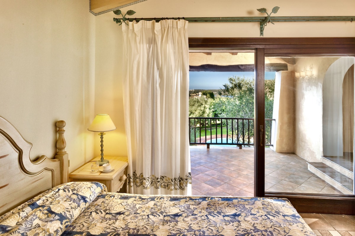 Villa b 'veduta tal-baħar affaxxinanti ħafna ddisinjata minn Jacques Couelles, il-perit magħżul minn Prince Aga Khan għal Costa Smeralda, b' ġnien privat ta' 1000 metru kwadru ġewwa resort b' pixxina (3 minuti bil-mixi) u aċċess dirett għall-bajja (5 minuti bil-mixi). Il-pixxina hija miftuħa mill-1/06 sal-15/9 b' għassiesa tas-salvataġġ. Fix-xhur l-oħra l-pixxina tinsab viċin. Parkeġġ privat għall-karozzi fuq barra. 5 minuti sewqan minn Porto Cervo.