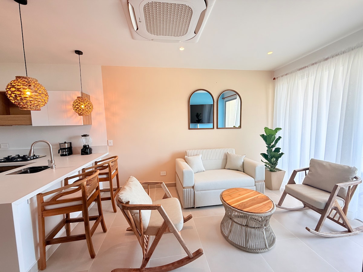 World's #1 Amenity: Crystal Lagoons, for the first time in Colombia. Relax and unwind in this tranquil, humble yet elegant accommodation, featuring a white-sand artificial lagoon, just like you're on the beach. The complex offers a gym, teleworking, outdoor exercise, and more. The apartment features air conditioning and a TV in the living room and bedroom, 900mb Wi-Fi, a refrigerator, natural gas stove, microwave, coffee maker, blender, air fryer, and more.