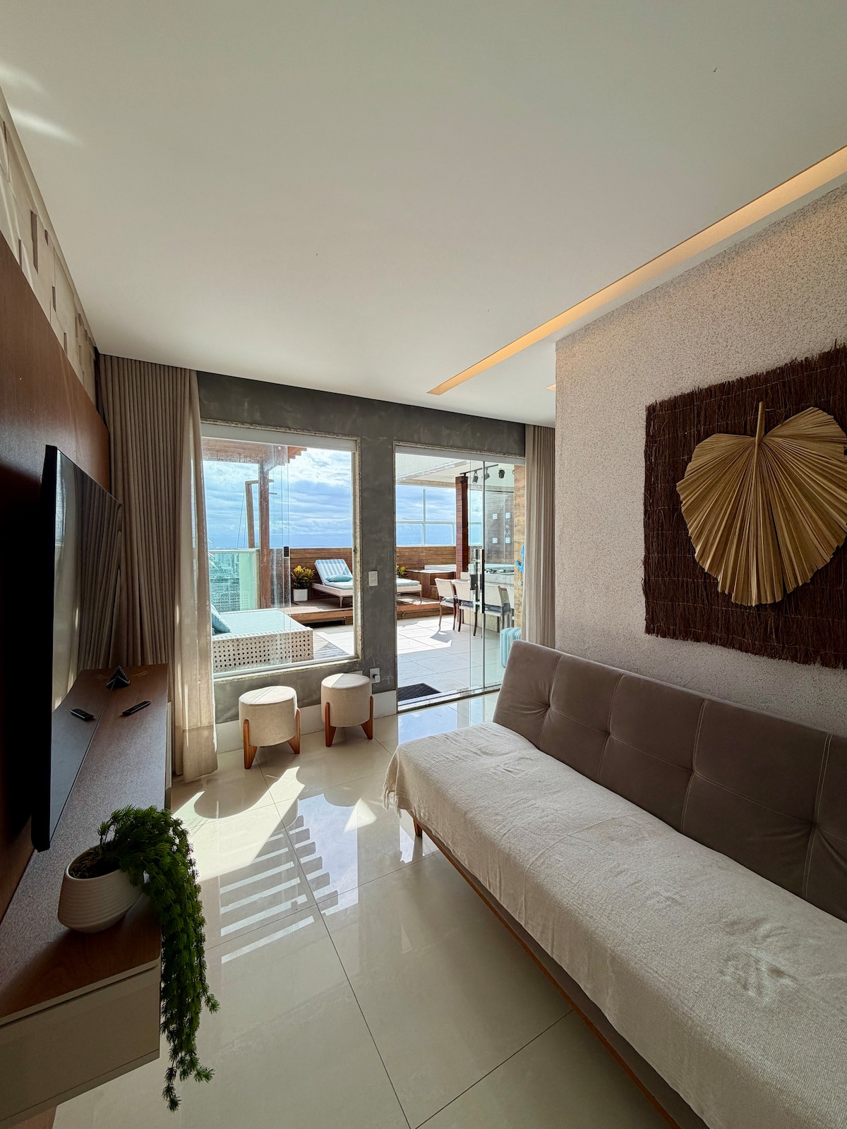 Cobertura com Jacuzzi e vista para o mar com teto solar. Muito espaçosa (65 m2). Melhor ponto da Praia da Costa, a melhor praia de Vila Velha! Cozinha totalmente equipada com utensílios diversos para bar, coqueleteria e taças finas. Suíte climatizada, confortável e aconchegante. Simplesmente a melhor experiência de hospedagem de Vila Velha! Sua estadia por aqui será perfeita! SÓ VEM !!!