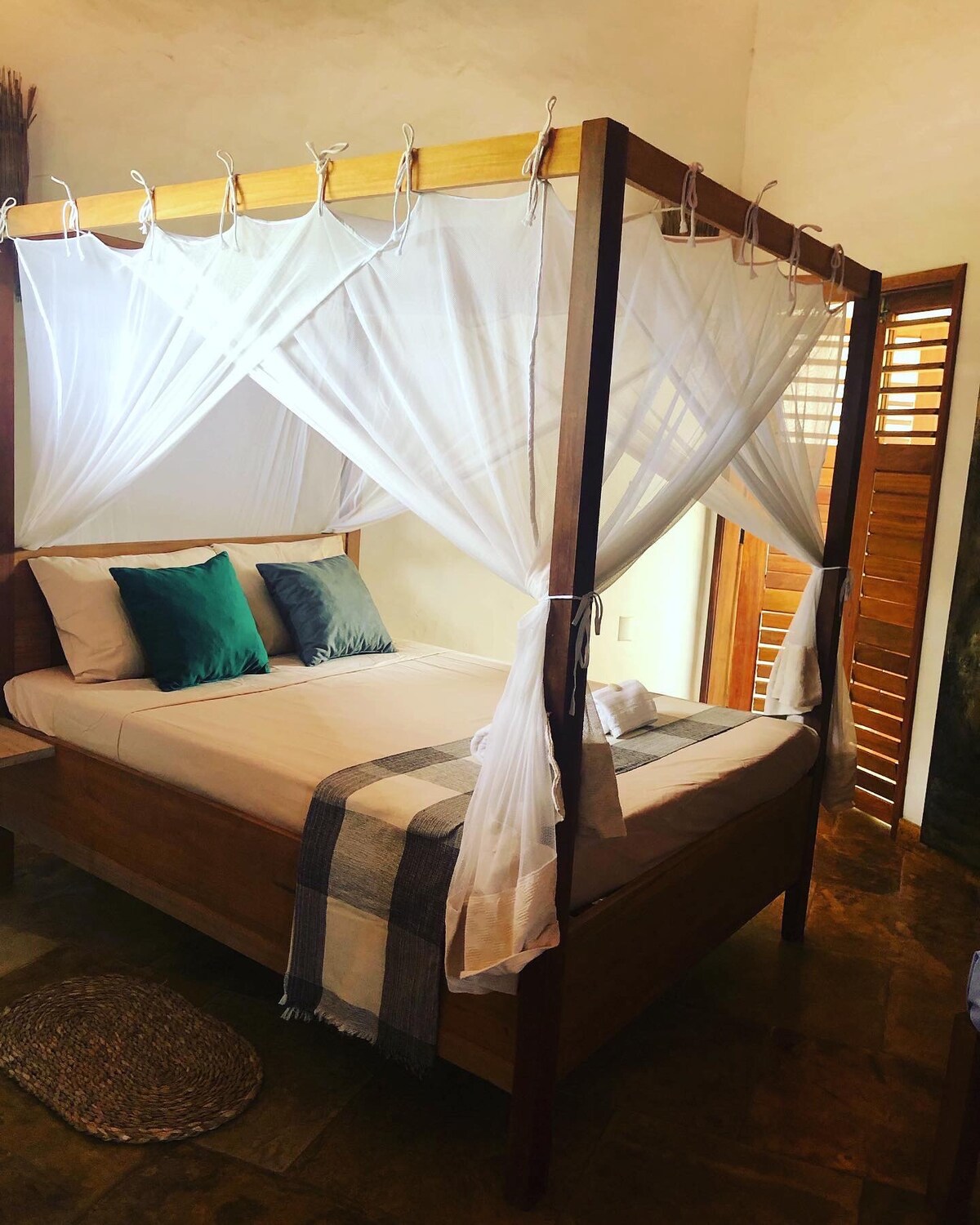 Cada suíte acomoda no máximo 3 pessoas, oferecendo uma cama de casal e um colchão extra de solteiro. A suíte também inclui uma varanda com rede e um pequeno quintal privativo com jardim.