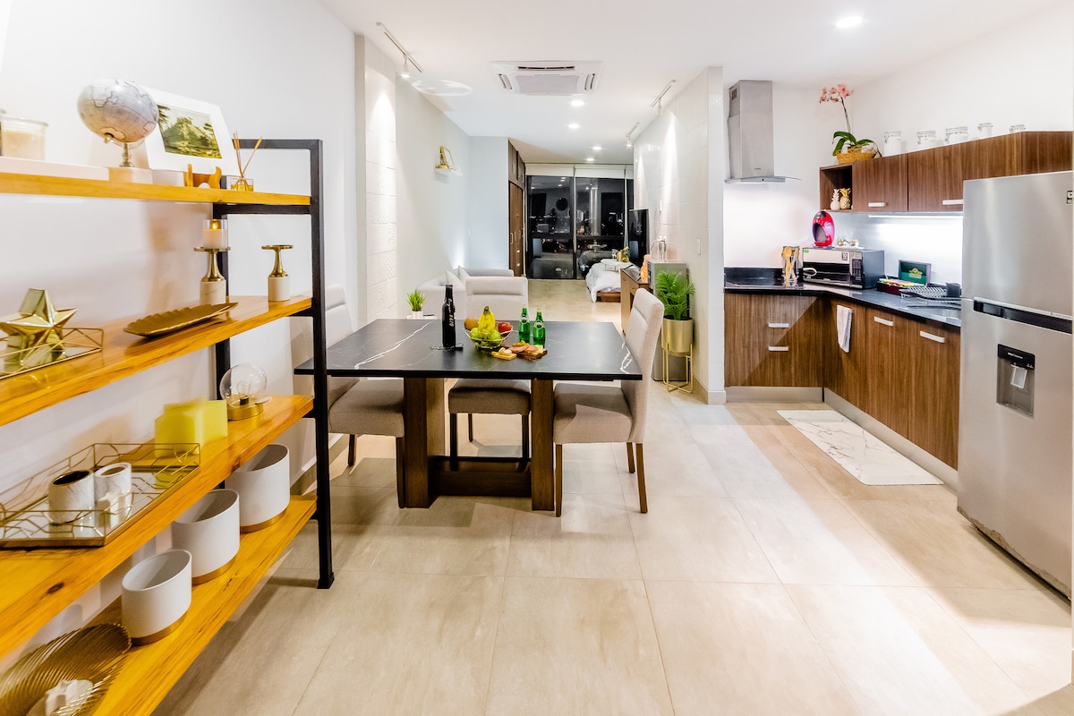 Merħba fil-kenn tiegħek ġewwa Temozón Norte, waħda mill-iktar żoni li qed jikbru malajr ġewwa Mérida, li għadha żżomm il-kwiet u l-ambjent naturali tagħha. L-appartament b' kamra tas-sodda waħda tagħna huwa ideali biex tirrilassa u tgawdi: għandu sodda king size, armarju, kamra tal-banju privata u sufan doppju komdu fis-salott għal iktar klijenti. Gawdi l-pixxina privata tiegħek fuq it-terrazzin jew ħu vantaġġ mill-kumditajiet tal-bini bħall-gym, il-pixxina komuni, il-park tal-pets u l-kamra tal-avvenimenti.
