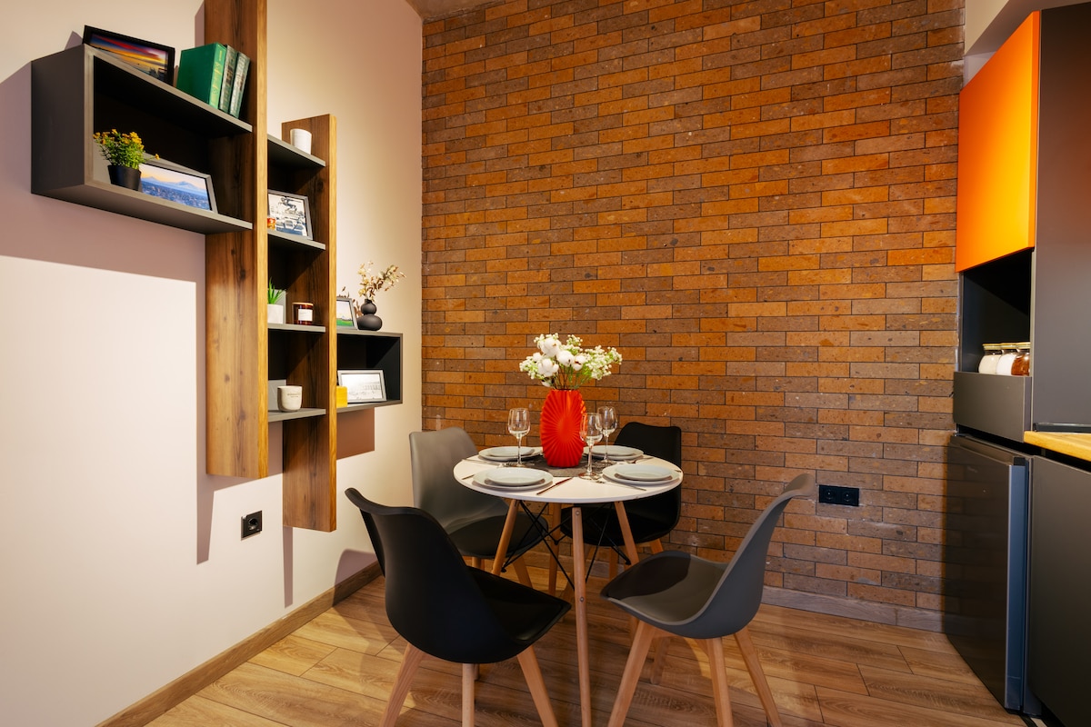 Studio komdu b' dak kollu li hemm bżonn biex tgħix, tistrieħ jew taħdem. L-istudio tinsab qrib iċ-ċentru tal-belt, 15-il minuta 'l bogħod miċ-ċentru ewlieni ta' Yerevan. It-tielet sular tad-dar, b' terrazzin u veduta mill-isbaħ tal-belt. Għalkemm huwa post ċentrali, tista' tgawdi l-ħin tiegħek fil-ġnien aħdar u tirwejjaħ arja friska, minħabba li d-dar tinsab f' nofs ħafna ġonna. Ippjanajna l-istudio u mgħammra b' dak kollu li l-klijenti jafu jkunu jeħtieġu.